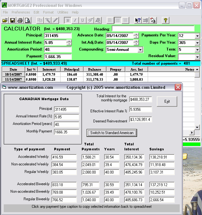 40 year amortization period mortgages for various reasons are currently very popular. If your only choice is a 40 year mortgage, when buying a house, then here is a helpful tip for easing the burden of excessive interest costs. The example explained is the one shown by Garry Marr reported on Sept 8, 2007 in the National Post. To keep the mathematics readable and informative I have rounded the figures!! According to the Canadian Real Estate Association, the average July 2007 sale price of a house in Canada was $311,000. An annual interest rate of 5.85% will cost a borrower $488,000 in interest costs over the 40 years, in addition to the $311,000 that must be paid back. Once you sign the 40 year amortization period mortgage papers your aim should be to lower the amortization period at the first opportunity. An indirect way of achieving this and at no additional cost is to ask your lender to allow you to make weekly payments. The five major lenders in Canada will allow this at no extra cost. You should at least elect to go with the non accelerated weekly payment. If you can find an extra $32 in your weekly budget, the accelerated weekly payment will save you $138,000 over the new reduced amortization period of 30 years. By paying the accelerated weekly, you have indirectly reduced your amortization period almost down to the “normal” 25 years and saved $138,000 in interest costs! If you make even larger weekly payments the savings increase further. Don’t expect your loan officer to enthusiastically advertise this method of savings. After all, what you save in interest costs the Bank loses on their bottom line. So don’t be fooled by all the fluffy features and benefits in the mortgage brochures. The other mortgage features may obscure this all important aspect! The most important aspect of your mortgage is the weekly payment plan, in order to save the most in interest costs! |