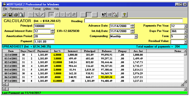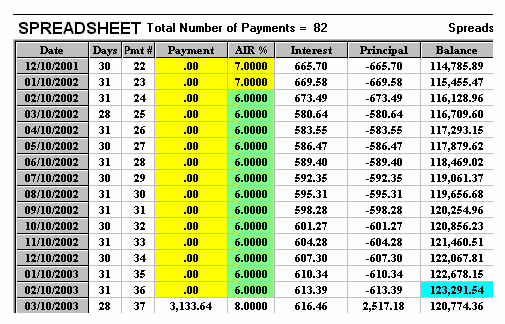 Adjustable Rate Mortgages are mortgages where the lender adjusts the interest rate each month or at an interval agreed upon by lender and borrower. If rates go down the borrower enjoys the benefits of paying less interest plus paying more off the balance providing the payment remains the same. If rates increase the lender enjoys the benefit of more interest at the expense of the borrower. This type of loan can be be a blessing and a curse. It is a fair gesture by a lender however verifying the balance owing at any time is extremely difficult unless the borrower has the appropriate financial software, such as MORTGAGE2 PRO. Adjustable rate mortgages (ARM) and variable rate mortgages are different names for the same thing. Americans call them ARMs and Canadians call them variable rate mortgages. Adjustable rate mortgages can yield tremendous savings to borrowers but the chore of verifying the changing amortization schedule can be overwhelming to a novice who is unfamiliar with amortization schedules. Some lenders will change the rate every month and leave the payment constant. Some lenders will recalculate the payment each month based upon the new rate and this type of ARM is very time consuming. It has been estimated that in North America, Billions of dollars each year in excessive interest is paid to lenders that make errors calculating ARMs. An added problem is, if the errors are at the beginning of the schedule they compound themselves throughout the entire schedule. Unless you verify the calculations you will never know. The changing rates can be simply typed directly into the amortization SPREADSHEET (yellow column) and the entire schedule is instantly recalculated, as in the example below. Using the MORTGAGE2 PRO software, changes in the nominal interest rate (Annual Interest Rate) are typed directly into the SPREADSHEET schedule. Payment #1, 12/14/2000 is the first blended payment and it is based upon the initial 12% as entered in the CALCULATOR. After the first payment was made the rate was changed to 6%. The interest due on a balance of $99,898.91 for the use of the money from 12/14/2000 to 01/14/2001 is $499.49 (.06/12 x 99,898.91). These large changes were purposely chosen to simplify the example. For example, the interest due on 12/14/2000 is 1% of the $100,000 a nice simple shift of the decimal point. After payment #2 was made the rate was changed to 3% for the upcoming month. The 3% annual interest rate, in the SPREADSHEET, is automatically divided by 12 and multiplied by $99,297.32 for an interest charge of $248.24 on 02/14/2001. The full payment #8, is applied towards reducing the balance to $94,408.52 because the interest rate was changed to zero on line 7 the month before.
