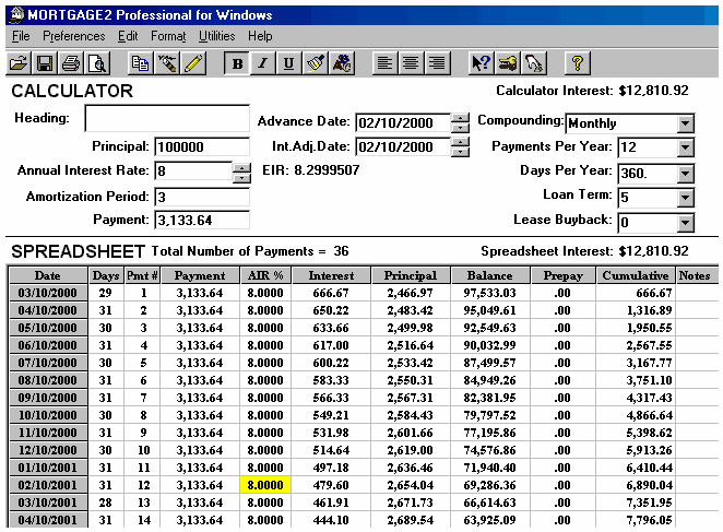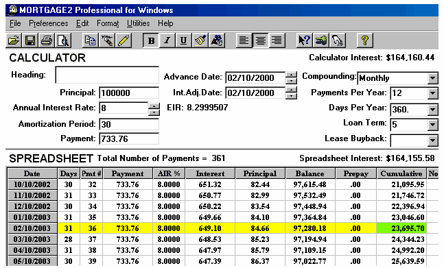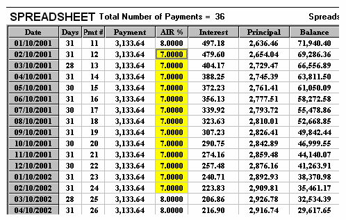 Assume you borrowed $100,000 and amortized the loan for three years starting at 8 % in the first year, 7% in the second year and 6% in the remaining third year. Monthly payments and monthly compounding were selected. QUESTION: How much interest would you save compared to paying 8% for the entire three years? Enter the data in the CALCULATOR section of the MORTGAGE2 PRO screen. The amortization schedule for that information will be immediately calculated and shown in the SPREADSHEET amortization schedule, as if the entire loan was to be at 8%. The entire schedule is not going to be at 8%, but you must start out in the calculator as that way then change the interest rates in the SPREADSHEET. Once changes are made in the amortization schedule SPREADSHEET the CALCULATOR information is no longer meaningful except as a reference point (Calculator Interest). Changes to the amortization schedule SPREADSHEET are now your focus. Using your mouse, place the cursor on the 12th payment interest rate cell (yellow) on the amortization schedule and change it to 7.000% and click on the cell, to insure the change is entered. When you click on the cell you will see the amortization schedule spreadsheet cells change indicating a cell change. Hold the shift key down and press the down arrow to highlight the cells down to the 24th payment and the amortization schedule should appear as below; Now do a Crtl+V (the standard Windows paste shortcut) and the amortization schedule appears as shown below; Do the same thing with interest rate cells 24 to 36 only this time using 6% and the amortization schedule will appear as below; All changes to the amortization schedule show up as yellow, however, the yellow colour for the portion of the interest rate column at 6%, was changed to green for ease of viewing in this example. Note, the monthly interest $223.83 portion for the 24th payment is determined by the value in the interest rate in the Int% cell above. This is how the program was designed to operate. Thus .07/12 x 38,370.98 = $223.83 You now have an amortization schedule for three years with a declining rate of 8%, 7% and 6% in the final year. The total interest cost due to the declining rates is $11,804.16 (Spreadsheet Interest) compared to $12,810.92 had you remained at the initial 8% throughout the 36 months (Calculator Interest). ANSWER: The declining rate, for this 3 year amortized loan, saved you $1,006.76 (12,810.92-11,804.16=1,006.76). The three year amortization period was purposely chosen in order to explain deemed reinvestment and show the significance of the effective interest rate. A 30 year amortization period example is shown at the bottom of this page and the savings achieved because of the three year declining rate are more significant.