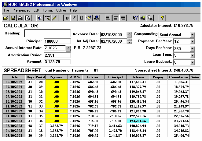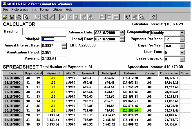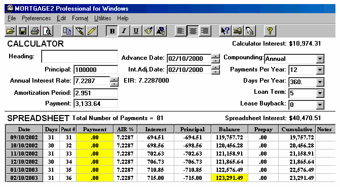 THE STORY BEHIND THE STORY A unique feature of MORTGAGE2 PRO is the ability to generate a negative amortization schedule. By generating an negative amortization schedule (all the payments set to zero) the future value of all the payments at the appropriate interest rates can be calculated. Using the mouse move the cursor up to the first payment and enter 0 (zero) and then click on the cell to ensure the change has been entered. Hold the shift key down and press the down arrow to highlight the cells down to and including the 36th payment line, and then do a Ctrl+V to copy the zero payments all the way down to the 36 th line of the schedule. In the balance column at the 36th payment is the value of $123,291.54 This is the future value of $100,000 appreciating at 8% in the first year, 7% in the second year and 6% in the final year. If the lender reinvests each monthly payment when received, this is the true return the lender achieves at the end of three years, that is $23,291.54 on the intial loan of $100,000. Using an ordinary financial calculator or the MORTGAGE2 PRO utility; The effective interest rate (EIR) of this 3 year loan (ARM) is 7.2287% As a cross reference, using the free downloadable m2factor.exe utility from the amortization.com site, the interest earned by the lender after 3 x 365 days (deemed reinvestment) is the same, that is $23,291 (see the annual rate below at $23,291.50). When a loan is annually compounded the effective interest rate and the nominal annual interest rate are the same. The real time saving convenience of the MORTGAGE2 PRO, negative amortization schedule feature is really appreciated when one needs to evaluate an ARM where the interest rate changes every month, the payments change each month and extra prepayments are made in between regularly scheduled payments. The deemed reinvestment feature would be very very time consuming if done manually as individual present value/future value calculations on a calculator. As a further point of interest if one used the effective interest rate of 7.2287% with annual compounding and did a negative amortization schedule, the same future value of $123,291.49 is achieved (the yellow highlighted cell in the balance column).