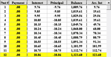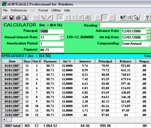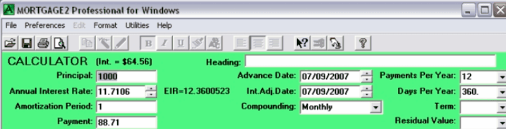 The theory is as follows. It is assumed the lender immediately lends out your monthly payments as he receives them (legalese .. deemed reinvestment) The amortization schedule below shows, if the lender did not reinvest each payment as he received them, at the end of the year he would only have received $64.56 in interest. Notice that in both examples interest calculations are made at the end of each time period but the monthly payment mortgage’s interest factor allowed the lender to achieve the same EIR as if the payments and calculations were done every six months. The standard Canadian legalese is as follows. “Blended monthly payments with a nominal interest rate of 12%, compounded semi-annually, not in advance “ This wording confuses people. The points below should help in understanding your mortgage documents. The ten commandments of Interest! 1.. Compound interest is interest paid on principal plus unpaid interest. 2.. When the payment frequency and compounding frequency are the same the interest factor for that payment frequency is the nominal rate divided by the payment frequency. Most US mortgages and personal loans in Canada and the United States quote a nominal rate with monthly payments and monthly compounding. For example a 12% nominal rate translates into a monthly interest factor of 0.01 (.12/12) and an EIR of 12.6825% ( (1.01)^12 = 1.126825 ). 3.. Compounding and calculation are different words and mean different things. 4.. Interest calculations are done at the end of the payment period and then a payment is made. 5.. Interest calculations are not made in advance. Interest is the cost of using the lenders money for a given period of time, paid at the end of the time period. 6.. The only way a loan could have interest compounded (compound interest) is when a payment is missed and the missed interest portion of the payment is added to the outstanding balance. So if only one payment is missed, then from that point on the loan has compounded interest. 7.. Interest for the lender is compounded when he reinvests each payment back out on the street at the same interest rate he is charging you. 8.. The reference to the compounding method in loan documents only serves to define the interest factor and unfortunately confuses the novice borrower. 9.. The EIR is calculated by adding 1.0 to the interest factor for the payment period and then multiplying it by itself by the number of payment periods per year. For example; Canadian Mortgage American Mortgage 10.. When the payment frequency and the compounding frequency are NOT THE SAME you cannot divide the nominal rate by the payment frequency to arrive at the interest factor. For Example; Canadian Mortgage i does not equal .12/12 rather i = ((1+R /2)^(1/6)) - 1 = 0.0097588 The advantage of using the EIR in comparing loans, (even though it is the theoretical rate the lender achieves using your money), is if two loans have identical EIRs for the same principal and payment schedule then it matters not which lender you go with, all else being equal. The equivalent nominal interest rate is when two mortgages because of the different compounding method have the same EIR. The two amortization schedules would be identical as they should be. Notice below, at four decimal places the calculator shows that 11.7106% with monthly compounding and monthly payments is equivalent to 12% with semi-annual compounding and monthly payments. The simplicity of stating the EIR for all loans eliminates the chance of compounding confusion for most people (pun intended). Its appropriate to note, the basis of the new Ontario “cost of borrowing” legislation (which used to be called the “Total Cost of Borrowing”) is that once all the fees and costs for a loan have been factored into the calculations the new (and larger) EIR is quoted as a percentage as the COST OF BORROWING. When lenders quote different nominal rates at different compounding frequencies they are banking on the fact (no pun intended) that your novice status as a mathematician will work in THEIR favour!