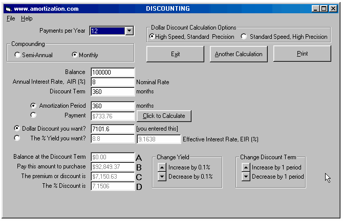 APR based upon variable future costs QUESTION: What if the borrower had monthly insurance premiums that were not constant but varied in the future? For example, using an 8%, 30 year amortized mortgage with monthly payments and monthly compounding on an amount of $100,000 as shown below. The first 10 years the monthly insurance premiums would be $81.67 and the next five years the premiums would be 16.67 per month. The present value of these two insurance premiums future cash flows must be calculated using 8% as the interest rate. Using the "3 out of 4 feature" in MORTGAGE2 PRO CALCULATOR we pretend we are going to borrow money at 8% for 10 years with monthly payments of 81.67 and the Principal will automatically be calculated as $6,731.36 which is the Present Value of that 10 year future cash flow. Now do the same for monthly insurance premiums of $16.67 but we must also do a PV-FV calculation to bring the $822.14 further back ten years to the present. The Present Value of the cash flows of the two insurance premiums is 6,731.36 + 370.40 = $7,101.76 and using the discounting program, the APR is 8.93% based upon 15 years (The % Yield you want). As can be seen below the APR based upon the full 30 years is 8.8% and that was easily calculated by pressing the up arrows and increasing the Discount Term to 360 months.