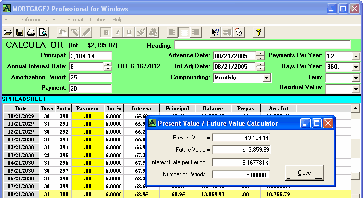 based upon future costs Enter a monthly payment of $20 for 25 years at 6% and let the CALCULATOR show you what you could borrow. The Principal of $3,104.14 is really the present value of a series of $20 monthly payments over the next 25 years at 6% using monthly compounding. Screenshot 4 is the negative amortization schedule showing that the Present Value/Future Value calculator agrees with the negative schedule (within pennies) as it should. Subtract the $3,104.14 from the Principal and recalculate on the Annual Interest Rate and the APR becomes 6.3351% as shown below.