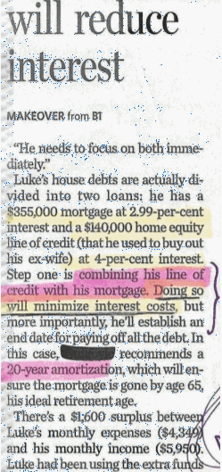 Are you contemplating combining two loans for the convenience of tracking one monthly payment? If the answer is yes, you will want to know what interest rate will give you the borrower the best financial advantage. Before you can appreciate the viability of blending two loans it will help to understand the phrase, .. deemed reinvestment. When you put money in a GIC the Bank will pay you a guaranteed interest on your money at the end of the year. If the face value of your GIC plus the interest is reinvested at the end of the year in another GIC for another year at the same initial rate and you continue renewing at the same interest rate this is called deemed reinvestment and you are receiving compound interest. The interest rate or return at the end of the second year is also called the effective interest rate you are receiving. This same concept applies for lending and investing. It is also used to evaluate and compare loans and mortgages but the time period is one month for monthly payment loans or mortgages. It is difficult to get a GIC that’s pays interest monthly instead of yearly and if you do, the rate is usually lower. Now pertaining to mortgages, it is also difficult for a lender to reinvest each monthly mortgage payment as it is received from you thus the deemed reinvestment calculation is more of an ideal scenario calculation with respect to loans and mortgages. Loans and mortgages are calculated exactly the same way, the only difference being the monthly interest factor, but I digress! Suppose you borrowed $1000 for one year at an annual interest rate of 12% the monthly payments would be $88.85. If you were in possession of an amortization schedule you would see that at the end of the year the schedule shows total interest you paid to the lender was $66.18 not $120 as you might expect (0.12 x 1000 = 120). The lenders deemed reinvestment calculation predicts that if he reinvests each monthly payment of $88.85 at the same interest rate he would receive ideally $126.83 not $120 due to compounding. In mathematical jargon, a 12% annual interest rate charged on your $1000 loan is worth to the lender, 12 months in the future, $1,126.83 and that is called the future value (FV). It is a common practice to calculate the future value (FV) of loans or mortgages for comparison purposes. Now let me use an example from a major Canadian newspaper, in which a “financial planner” advises a client. The planner said, the client by combing his line of credit with his mortgage will minimize interest costs without any mention of the interest rate of the blended loan. How the lender calculates the blended loan rate will determine the costs/savings .The example above indicates three methods, two are obvious and one not so obvious to a novice of mathematics of how to arrive at the new blended rate for the blended loan. BLENDED RATE AVERAGE RATE WEIGHTED AVERAGE RATE I will end by stating, a financial person dealing with mortgages at one of the big Banks in Canada would not give me what rate their Bank would charge. The reason was this Bank only does this for non hypothetical loans and only for their clients (articles written in the newspaper are hypothetical I guess). So much for transparency and Financial Literacy in Banking Industry!