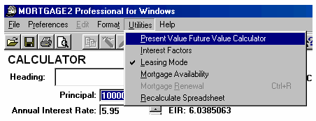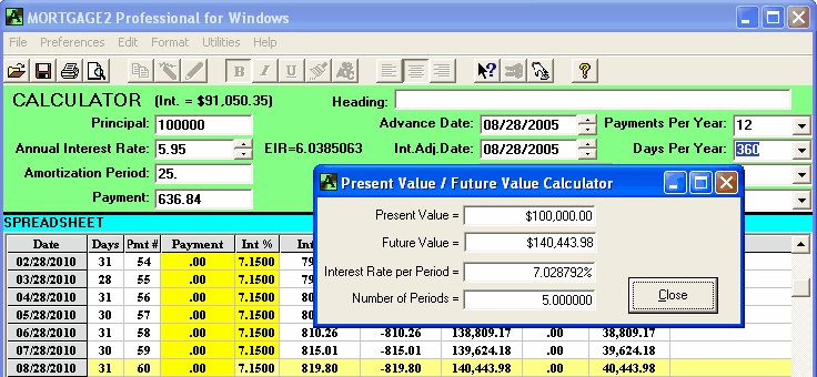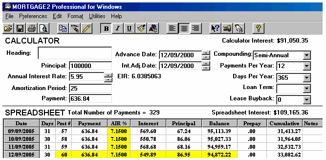 QUESTION: A lender offers a mortgage at 5.95% for the first year and 7.15% for the remaining four years or a blended rate of 6.85% for 5 years. Which is the better option? Let us first generate an amortization schedule based upon the 5.95% rate, then change the rate inside the SPREADSHEET schedule. Assume it to be $100,000 amortized for 25 years and we will use semi-annual compounding as this example is taken directly from a Canadian lenders brochure. We will also assume a constant cash flow meaning that the monthly payment remains the same over the 60 months. Some lenders recalculate and change the monthly payment at each rate change so it is always wise to ask the lender which method they use. We now change the rate from 5.95% for the last four years to 7.15 % as shown below; NOTE: the rate change for the 13th payment is entered at the 12th payment because as soon as the 12th payment is made the rate is immediately changed, that is how the MORTGAGE2 PRO amortization spreadsheet is designed to work. The constant, 360 day monthly interest factor for an AIR of 5.95% with semi-annual compounding is 0.004897965062376 x 98,342.33 = 481.68 (green) The balance owing (at Pmt #60 in green) to the lender after 5 years is $94,852.89 using 5.95% for year one and 7.15% for the next four years. One might be tempted now to just guess at a new rate until the balance after 60 payments is the same ($94,852.89), and that would be the blended rate. It would be nice if it was that simple, but it is not. Lenders reinvest your monthly payment each month (deemed reinvestment) in order to achieve the yield on your mortgage. For example a mortgage at a nominal rate (nominal rates are also called annual interest rates, AIR) of 12% using semi-annual compounding actually gives the lender a 12.36% effective interest rate (EIR). For every nominal rate quoted there is a corresponding effective interest rate due to the type of compounding chosen. If the nominal rate is annually compounded then the effective interest rate is equal to the nominal rate, thus a yearly basis is always implied when one speaks of an effective interest rate. A mathematical "trick" that works only for mortgages that have semi-annual compounding allows one to quickly figure out an EIR from an AIR is to divide the nominal rate by two, shift the decimal place two places to the left, square the result, shift the decimal place two places to the left again and add it to the initial nominal rate; AIR=12% EIR=12.36% One of the unique features of MORTGAGE2 PRO and MORTGAGE2 PRO PRO is the ability to to perform a present value /future value calculation on a cash flow and show what it accumulates to in the future. This is exactly what the lender does. Thus put all of the 60 payments equal to zero and the cash flow of $636.84 to the lender will accumulate to $140,443.98 if the lender reinvests the payment received each month. You now need a simple PV/FV calculator or using the one in MORTGAGE2 PRO that allows one to do a PV/FV calculation as shown below; The 7.028792 % from the PV/FV calculator is the effective interest rate, EIR. To get the corresponding AIR, using the CALCULATOR, take a few guess' at an AIR, and recalculate on any variable except the AIR, until you get the EIR to come close to 7.029 The 6.91% (which corresponds to the EIR of 7.0293703) is the correct blended rate that is equivalent to year one at 5.95% and the next four years at 7.15%. ANSWER: The lender offering a blended rate of 6.85%, is actually giving borrowers a bit of deal! Below is proof that 6.91% is the correct blended rate. That same cash flow appreciating at 6.91% (deemed reinvestment) for the next 60 months accumulates to $140,447.77 which is within $3.79 of the initial calculation. The difference is because the outcome is very sensitive to the number of decimal places used. It should be mentioned that you can also use a 365 day year in this analysis. North American lenders use both methods for monthly payment mortgages for various reasons. Below is the exact analysis as above, except using a 365 Days per Year basis, which is called an exact day monthly payment mortgage in the industry. You will notice after 60 payments (12 payments @ 5.95% and the remaining 48 payments @ 7.15%) that the borrower owes the lender approximately 20 dollars more using this method ($94,872.22 - $94,852.89 = $19.33). The lender is making a "little" more via the 365 day method. A complete analysis shows that the blended interest rate is greater in the third decimal place, and thus quoting rates to 2 decimal places hides this fact. The purpose of the exercise is to demonstrate the method used to verify the blended rate figure within reasonable limits. As mentioned above the deemed reinvestment method is very sensitive to the number of decimal places used in the calculation. Here is an area where standardization would be in order at least in North America.