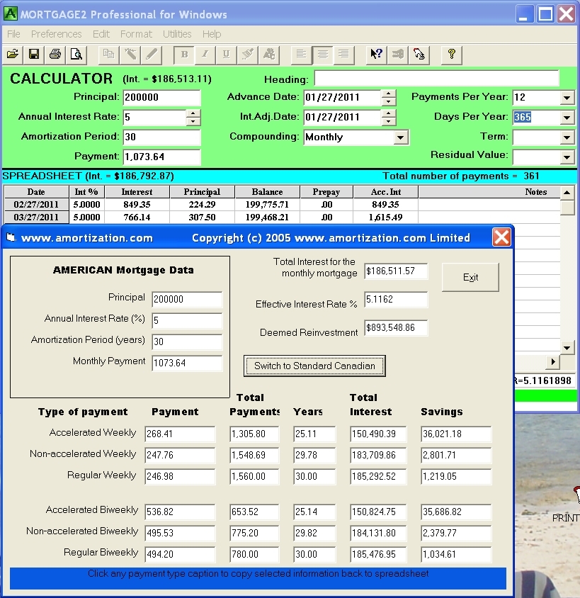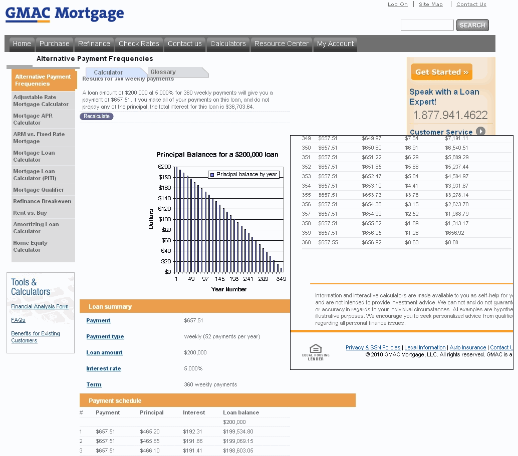 I want to thank the person who viewed my YOUTUBE mortgage video and brought the GMAC weekly and biweekly mortgage payment plan to my attention. It has been awhile since I searched the web for weekly lenders in the USA because in the past there were none. I will strive to be more current on the USA mortgage market. In view of the fact that Americans now have access to these new weekly and biweekly plans I will be more specific regarding my explanation why a Canadian monthly, biweekly or a weekly payment mortgage plan is better than any current USA mortgage plan. I will use the weekly example to prove my point. The example I wanted to compare to GMAC’s calculator output is as follows. The most important item to look at in any amortization schedule is the interest portion of the very first blended payment. If you divide that initial interest portion by the Principal borrowed ($200,000 in this example) you will know the value of the INTEREST FACTOR for the period of time. In this example it’s the weekly interest factor that is used at the end of each week to calculate the interest owing on the outstanding balance. The larger the interest factor the more interest you pay. The interest factor depends upon the “type of compounding” and the number of days in the year. The more frequent the compounding the larger the interest factor. A 360 day year (aka the “Banker’s year” in the USA) for weekly and biweekly payment mortgages also gives rise to a larger weekly interest factor compared to a 365 day year factor. The number of days per year chosen by the lender influences the value of interest factor. In this case the interest portion of the very first blended weekly payment I initially arrived at using my software (semi-annual compounding and a 365 day year which is now the defacto standard in Canada for weekly and biweekly mortgages) turned out to be $189.51 which is less than GMAC’s $192.31. The Canadian weekly interest factor (Screen C) is therefore smaller than GMAC’s method because GMAC is using more frequent compounding and also using a 360 day year in arriving at their weekly interest factor (Screen B). Some may say I am nitpicking but the difference in interest costs between the GMAC weekly in this example and the Canadian weekly is (compare the SPREADSHEET (Int= of screen B and C) is 36,703.64 minus 36,034.37 which is $669.23 more in interest! In this example, paying the same weekly payments using GMAC’s method, for the same annual interest rate for the same amount of Principal borrowed you pay $669 more in interest. The excess interest paid becomes even more pronounced when the amortization period is longer than 6.9 years. Six hundred and sixty nine dollars may not sound like a lot of money to some people but I would bet you would rather have it in your pocket instead of GMAC’s. Would it not be more informative and transparent to American borrowers to have a comparison screen (Screen D) similar to the one major Canadian Banks provide to their borrowers (sometimes reluctantly) showing the traditional monthly payment then comparing the savings by going to weekly or biweekly payments? This is common sense. I will repeat what I said in my YOUTUBE video, not all Banks are equal. Conclusion: