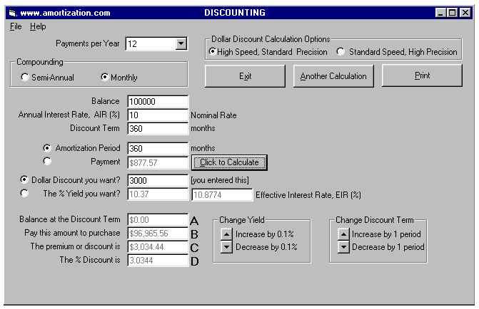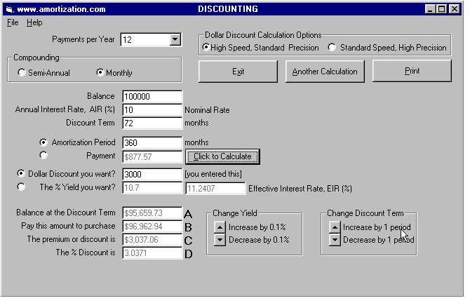 EXAMPLE In the USA, the Truth in Lending interest rate is called the APR. For a 30 year loan at 10% plus the three points repaid over the full 30 years, the APR is 10.37% (you enter the 3 points, 3% of $100,000 as $3000 as the Dollar Discount). The APR depends upon how long you keep your loan. If the $100,000 loan was repaid after 6 years (72 months) rather than 30 years (360 months) its APR would be 10.70% as shown below.