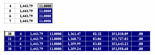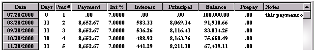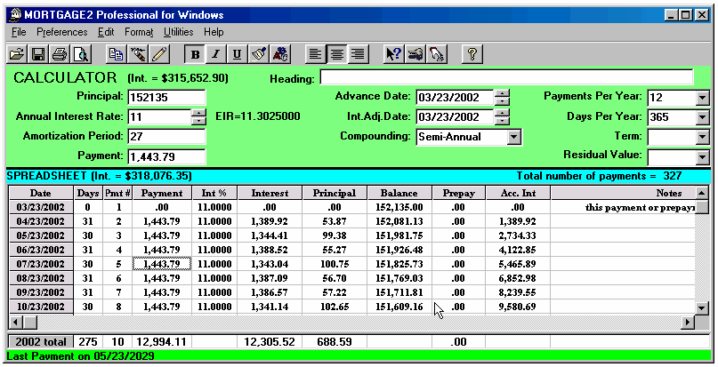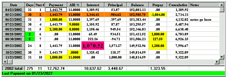 Working in the SPREADSHEET 1.. highlight an area prior to printing 2.. to make changes to a schedule 3.. to highlight a part of a column for its totals (clicking and highlighting with the mouse) For example, the amount of principal paid in 2001 is shown below as $502.76 on the 2001 Total line at the bottom of the SPREADSHEET because one of the cells (Pmt#1) was clicked by the mouse. And if you click using the mouse on Pmt#6 cell in the year 2002 the total line shows the yearly totals on the 2002 total line. The sub totals for payments #3 to #6 are shown on the Selected line at the bottom of the SPREADSHEET. Using the mouse you can highlight any area you wish for subtotals. Once you make changes to a schedule there is no reason to go back to the CALCULATOR as the CALCULATOR now only serves as a reference point. To avoid confusion you could go to the Preferences Menu and click on, Conceal Loan Calculator. The CALCULATOR would disappear. All you need to do is click on the first payment of the SPREADSHEET and click on the yellow pencil icon to insert an extra payment and you have the schedule below is simplified; (Screenshot 14) The spreadsheet contains all the information needed to be self explanatory (the compounding will be shown in the heading when it is printed). Payment #1 is "Days 0" and payment #2 is really the first payment due one month after the advance date of 03/23/2002. Once a SPREADSHEET cell is clicked on, the tool bar displays the icons that are active, by changing from grey to a colour. The cell you click on will display a fuzzy border as shown in the third payment below (powder blue). The only way to exit the spreadsheet is to click on any of the 11 calculator cells. The ENTER key enters your new information and moves you down to the next cell. If no information is entered, pressing the ENTER key moves you down one cell without any changes. The arrow keys are used to enter information in a cell and move in the direction pressed. Changes can only be made to the yellow coloured columns plus the Date column. Below is an example screen shot of a SPREADSHEET that shows how flexible the SPREADSHEET can be.