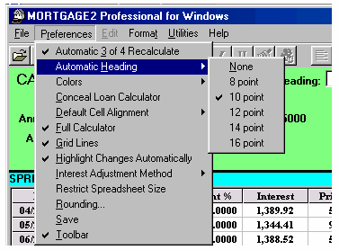YOUR PREFERENCES Automatic 3 of 4 Recalculate: When selected on, entering any three of the first four calculator variables will automatically calculate the fourth. Automatic Heading: Check this to set the font size of your financial headings that appear on the top of every page of the schedule. Font sizes larger than 10 point will move your headings off centre. The Preference Menu above is what is usually selected (in advance) on all the downloaded files. Checking the 12 point makes the AMOUNT BORROWED in the heading of the schedule 12 point. Background Calculations: With this feature checked on, As soon as you type a change into the spreadsheet, the entire schedule is recalculated. If you were making a lot of changes in a large spreadsheet then it would save time to turn this off until all the changes are made. You could them turn it back on or just press F6 to recalculate all the changes. Colors: This lets you change colours on the five areas shown. Default Cell Alignment: This enables you to position your numbers in the amortization SPREADSHEET. The options are Centered, Left Aligned, or Right Aligned. Full Calculator: If one was going to do a lot of what if calculations utilizing the 3 out of 4 feature, then it would be much faster to turn off the full calculator. By holding down the tab key you can move in a a continuous loop in the first four calculator boxes only. The remaining calculator boxes are greyed out. Grid Lines: This turns on or off the lines for the amortization SPREADSHEET. ON - (Screenshot 23) OFF - (Screenshot 24) Highlight Changes Automatically: If one is making a lot of changes in a SPREADSHEET it is convenient to leave this feature on as it is easier to spot changes (yellow is the default colour). Interest Adjustment Method: Usually, it is best to leave it on Compounded Interest. Thus if your mortgage was calculated using semi-annual compounding the Interest adjustment would automatically be calculated using semi-annual compounding. Few Lenders use Exact Simple Interest any more for interest adjustments but the option is available to verify schedules of an earlier date. Restrict Spreadsheet Size: If you are working on a 20 year amortization period schedule and you start doing a lot zero payments the size of the spreadsheet will never grow or expand past 20 years. This feature just prevents a lot of wasted calculation time. Rounding: The choice is yours. Standard Rounding will more than likely allow your schedules to agree with most lenders. Save: ALWAYS be sure to click on the Save button before you exit the Preferences Menu, or else your preferences will not be saved. Toolbar: The choice is yours. Have this checked to enable the icons above the CALCULATOR. ON - (Screenshot 27) OFF - (Screenshot 28)