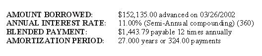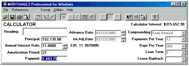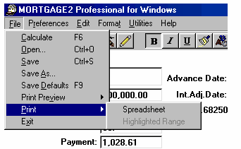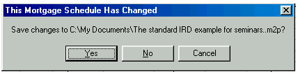 Click here for a Quick Reference Sheet The main screen starts with default information in the CALCULATOR and an amortization schedule SPREADSHEET based upon the default information in the CALCULATOR. Each time new information is entered in the CALCULATOR the SPREADSHEET will automatically generate a schedule based upon the new information. When you first run the program the cursor will be in the Principal box of the CALCULATOR and the background colour of the box will be blue. To move from box to box to change information press the tab key. The tab key moves you forward and shift+tab moves the cursor backwards. Holding the tab key down will cause the cursor to move in a continuous loop in the CALCULATOR. If you change any three, of the first four CALCULATOR boxes the remaining box will be automatically recalculated. You cannot specify information for all four boxes, as that would leave nothing to be calculated. For example, what would the interest rate have to be in order to borrow $200,000 for 31 years at monthly payments of $1500??? Answer, 8.4542%. The effective interest rate (EIR), 8.6328837 is displayed to the right of the nominal rate of 8.4542%. The EIR depends upon the type of compounding selected. The interest adjustment date defaults to the advance date unless you specify a different date. The Term input box is only important if you are going to renew a mortgage before the term expires, and effects only the calculation of the interest rate differential, IRD. If you change only one of the first four CALCULATOR boxes then you must decide which of the remaining boxes to recalculate, just like any hand held financial calculator. The instant you make a change to any CALCULATOR box the RECALC message appears and the SPREADSHEET is cleared. The CALCULATOR is waiting for one of two responses. Either you are changing two more calculator boxes or you are going to recalculate one of the remaining boxes. To recalculate a box, click on the box and press the F6 key or click on the prompt message in front of the CALCULATOR box. Both methods recalculate the information, in that box and the RECALC message will disappear. The SPREADSHEET will again appear with appropriate information. For example, what if you wanted the amortization period to be 27 years and pay $1500 per month at a 9% interest rate, how much Principal could you borrow?? Answer, $184,805.38 When the SPREADSHEET contains the appropriate mortgage information you can save the schedule. If the file/schedule you were making changes on already had a name you can click on File, Save and it will be saved with the changes. If you try to exit the spreadsheet before saving your spreadsheet changes you will be prompted by the message; If you are working on a new file/schedule (making changes) you can save it as a file with a unique name by clicking on; File, Save As. Your amortization schedules can be saved with meaningful names which will make it easier to recall when opening spreadsheet files as shown below;