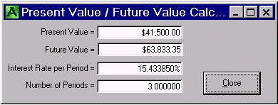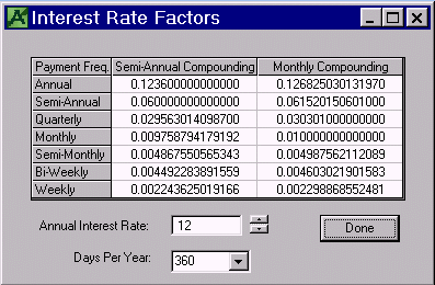 The following example of an interest accruing loan was purposely chosen even though the interest rate is high compared to the current rates in 2004. This particular example was used extensively by the mortgage brokers section of the Ontario Ministry of Finance in 1992. It is easier for a novice to follow the same example set out in the governments publications. Once the concepts are understood then any rate or principal can be used in full confidence. A mortgage with a face value of $45,000 is written up with an annual interest rate of 12% utilizing “semi-annual compounding, not in advance”. The loan is to be repaid in three years. No payments of principal or interest are to be paid during the three years. At the end of three years the outstanding principal and interest will be repaid in one payment. The total cost of all the fees relating to the loan is $3500. QUESTION: What is the effective interest rate of this loan? ANSWER: Just about any financial calculator could be used to solve this problem providing you are capable of calculating the semi-annual compounding, monthly, interest factor, i. Where: i = [(1+R/2)^(1/6)] – 1 and R = the annual interest rate i = 0.009758794 and the ^ operator is the exponent operator or you could use the MORTGAGE2 PRO, Utilities Menu and select, Interest Factors,