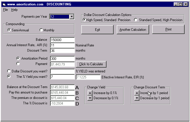 Two years ago, Bob and Mary borrowed $152,135 amortized for 27 years, and signed a five year term at an interest rate of 11%. Now, three year term interest rates are 7%. Bob and Mary would like to pay 7% interest for the remaining 3 years of monthly payments, instead of 11%. The Lender asked them for a $15,440 interest rate differential (IRD) payment along with their 24th monthly payment if they wanted the interest rate lowered to 7% for the remaining 3 years. How can Bob and Mary make an informed decision about paying the $15,440? This is the same example as the IRD example in the Mortgage Article section. The only difference is the way one thinks about discounting. Instead of thinking of the IRD amount of $15,440.04 as a "penalty" just think of it as the amount of money required to give to the lender so that the lender make a return of 7% instead of 11% over the next 36 months. |