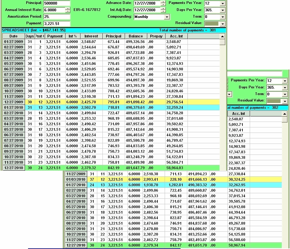 Interest is accrued daily on mortgages by definition. Just because an interest calculation is performed at the end of the month does not mean interest is not accruing daily. On the day you take out a mortgage, an interest clock starts ticking. With a traditional fixed rate, monthly payment mortgage, an interest calculation is performed at the end of the month based upon a 30.4167 day month (365/12). The year (aka the banker’s year) is assumed to be divided into 12 equal months and is hardwired into most financial calculators. In contrast, a "monthly compounding" mortgage using a banker’s year at an annual interest rate of 12%, as an example, converts to a CONSTANT monthly interest factor of 0.01 because the year is divided up into twelve EQUAL months as mentioned above. The interest factor is used to calculate the interest owing to the lender at the end of each month. The 365 day mode in my software utilizes the exact number of days between payments therefore eliminating the problem of late fees and/or prorating interest. See the attached example where the 12th payment is 7 days late. You simply change the date of the 12th payment (add 7 days) and the entire schedule is instantly recalculated taking into account the late payment. There is no reason for a bank not to readily provide a customer with an accurate and timely recalculation involving late payments. If your bank does not have this capability of handling late payments as easily as my software does, then consider changing banks!