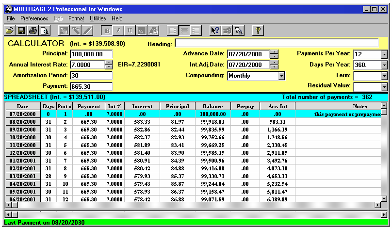 DIGRESSION (Screenshot 2) The initial Annual Interest Rate, typed into the calculator box, of 12% (1% per month) calculates the $100 interest portion of Pmt #1. The 6% annual interest rate, shown in green (.5% per month) typed into the Int% cell of pmt #2 calculates the $40 interest portion of pmt #3 (.005 x $8000 = $40). The 6% annual interest rate, shown in orange (.5% per month) typed into the Int% cell of pmt #5 calculates the $25 interest portion of pmt #6 (.005 x $5000 = $25). The prepayment figures in yellow where specifically chosen so the interest calculations were easy to see. This digression will help one understand why an extra payment was inserted at the start of the amortization schedule example shown below. Because the interest calculation for the very first payment in the amortization schedule is based upon 7%, the initial data, we can employ a unique feature in the MORTGAGE2 PRO PRO program. Place the cursor on the very first payment line of the schedule and insert a payment by clicking on the yellow pencil symbol. The new schedule will appear as below, (inserted payment shown in light blue); Change the interest rate to 5% for the first six months as shown below. Now make all the payments zero in the amortization spreadsheet, down to and including payment 73. This is actually a unique feature of MORTGAGE2 PRO PRO as it is generating a negative amortization schedule which has the same effect as doing a future value calculation on the monthly cash flow. The value (in green) $150,505.51 is the future value of a series of payments of 665.30 appreciating at 5% for the first six months and appreciating at 7% for the last 66 months. Using any financial calculator it is now possible to calculate the overall interest rate over the 72 month period, by doing a variation on the Present Value (PV) / Future Value (FV) keys. set PV= 100,000 FV= 150,505.51 n=6 years Calculate i%=7.05132 The interest calculated, 7.05132 (i%) represents the effective interest rate (EIR). The EIR is always greater than the stated annual interest rate (AIR) due to the method of compounding selected. By trial and error and typing in various Annual Interest Rates (AIR), starting with 6.7% on the MORTGAGE2 PRO calculator it does not take long to see that an AIR of 6.8332% with monthly compounding is exactly the same as an EIR of 7.05132%. ANSWER to QUESTION 1 If the ABC Lending Co. offered you a different annual interest rate of 6.8332% using monthly compounding it would be exactly the same as this 5% for the first six months smoke and mirrors option. To be consistent, in vernacular, you could also call this stated annual interest rate of 6.8332% with monthly compounding, the overall interest rate as mentioned early in the example. In a perfectly simple world all you would need to know, in order to compare this smoke and mirror option, is the EIR of 7.05132% vs 7.2290%. When you borrow any money you are always paying the EIR because that is the rate you would be getting if you borrowed money from yourself and reinvested each monthly payment at the same rate payable to yourself (this is called deemed reinvestment). The 7.2290 is the EIR of the mortgage at 7% with monthly compounding, over the 72 months.