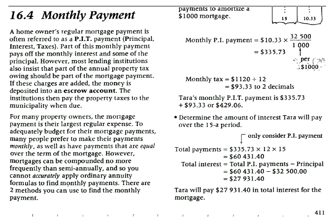 Is it any wonder that people are confused regarding mortgage calculations. Our children are being mislead by being taught from books that contain errors. Below is an actual scan of page 411 of the book "Mathematics for a Modern World" book 4, second edition, published by Gage Educational Publishing Company, in Toronto. The bottom of the paragraph on the left side states that "you cannot accurately apply ordinary annuity formulas to find monthly payments" for a Canadian mortgage because of semi-annual compounding. It then goes on to show the student how to use tables of semi-annual compounding factors to arrive at the exact monthly payment. Duh!!! Guess where the tables of semi-annual compounding factors came from, a mathematical formula? The purpose of the mathematics book should be to teach student mathematics and algebraic formulas and equations, not how to look up tables. We can train monkeys to look up tables. We should be teaching our children, solid, practical mathematics that will be of some use to them in life.