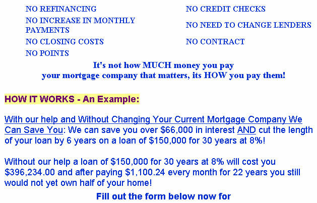 Below is a classic example, of smoke and mirrors, not to mention a misleading web advertisement . Let us investigate further into, .. "HOW IT WORKS - An Example". Let us look at this claim a little closer. Not to be a nit picker but the monthly payment quoted is not very accurate, it should be $1,100.65 not $1,100.24 as can be seen immediately below. The reference point is the total interest you would pay in this example, that is $246,233 (to the closest dollar) if you did nothing. The only way that this company can save you money by chopping 6 years off the amortization period (thus reducing it to 24 years) and keeping the monthly payments the same for a mortgage of $150,000 is to have the interest rate reduced to 7.2525% from 8% as you can see from below, by changing the amortization period to 24 years and then recalculating on the annual interest rate. Your savings would be $79,248 ($246,233 - $166,986 = $79,247) not the $66,000 as claimed. What happened to the difference of $13,247? ($79,247-$66,000=$13,2478) An amortization schedule, or a calculation like the one above, in advance, before signing anything, would certainly shed some light on this matter. BUYER BEWARE !!! Amortization Schedules have been around since 450 BC, when Nehemiah the governor of Jerusalem reformed the mortgage usury laws.