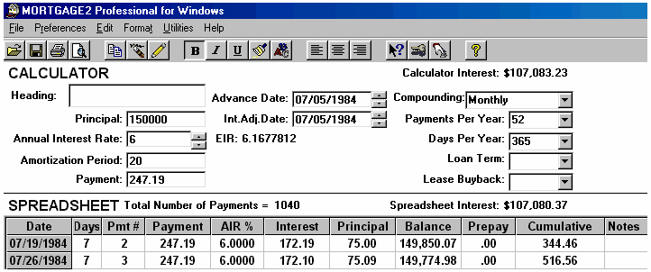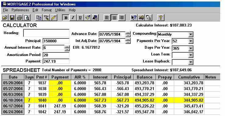 ANOTHER EXAMPLE A simple financial plan to follow in order to retire is as follows. Once your mortgage is paid off use the weekly payments to invest in a financial vehicle that will give you at least the same return your lender was receiving on your mortgage. Assume a young married couple age 20 ,took out a $150,000 mortgage in 1984 and paid it off in 20 years, when they were 40 years old. They have been accustomed to the weekly outlay of $247.19 so why not continue putting $247.19 away each week for the next 20 years in a financial vehicle for retirement. Consult a Financial Planner to explain the details of how to do it properly, so that the payments are tax deductible. The mathematics of the plan are as follows. The negative amortization schedule below is actually showing what $247.19 per week will accumulate to after 20 years. After 20 years, the 60 year old couple will have a retirement nest egg of almost half a million dollars ($494,905.02). More than likely the interest rate will not be exactly 6% for the next 20 years; however 6% is a conservative estimate of what to expect. It is a starting point that can be refined. The point is, ... you need a first approximation or starting point, .. rather than doing nothing, guessing, or assuming you will win the lottery. As a side issue on weekly or biweekly payment mortgages, check out how the same example can exhibit two different effective interest rates (EIR) depending upon how your lender chooses the number of days in the year.