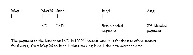 If you buy a house for $100,000 and the deal closes on the 26th of May (you sign the papers and hand over your lenders cheque of $100,000 to the person you bought the house from) the Advance date is the 26th of May. MM/DD/YYYY is the default format. June 1, 1999 is entered as 06/01/1999 If you enter 06/01/99 it will automatically change to 06/01/1999 upon pressing the tab key. The day you receive the money is the advance date and the first monthly payments is due one month later.