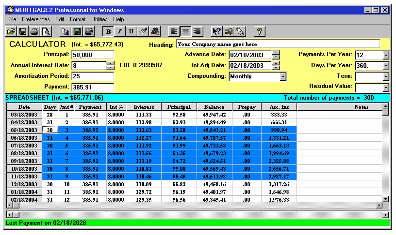Click on the Heading: box with the mouse to gain access. Type in anything you want to be printed at the top of the amortization schedule when printed. Real Estate lawyers that generate many schedules a day often have the their company name in this spot thus eliminating the need to retype it each time.