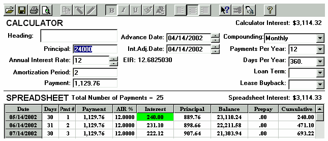 Some lenders use the Rule of 78 to arrive at the interest portion of a loan payment. The rule of 78 takes the total interest for a loan and apportions excessive interest to the early payments as compared to an amortization schedule. If the lender uses conventional calculations to arrive at the total interest for the loan but uses the rule of 78 to apportion the total interest cost over the life of the loan then do not take out a lengthy loan and pay it off early. The example below will illustrate the point. A simple example of $24,000 at 12% with monthly compounding, amortized for two years (24 monthly payments). An annual interest rate of 12% is purposely chosen because most people can do the very first monthly interest calculation in their head. 12% a year with monthly compounding is 1% per month. Thus after one month the interest for $24,000 is $240 (see the green cell below, 1% which is 0.01 thus .01 x $24,000 = $240). The rule of 78 will use the same total interest of $3,114.32 however it apportions $249.15 to the very first payment. A traditional amortization schedule apportions $240, the correct amount to the first payment. RULE of 78 Interest allocated over 24 payments is shown below (white background). If the loan was paid back as $24,000 plus the $3,114.32 over 24 even payments of $1,129.76 there would be no problem. The problem arises when you pay the loan off early as in after 12 months. After 12 months using a conventional amortization schedule, the balance owing after the 12th payment is $12,715.57 and the accumulated interest paid during those 12 months is $2,272.73 Using the rule of 78 method the accumulated interest paid during those 12 months is $2,304.59 which is $31.86 more in interest. The difference becomes more pronounced as the amortization period and the loan amount increases. For example, on a loan of $100,000 amortized for 4 years at 12% with monthly compounding the difference in accumulated interest paid after one year is $564.82 which is no small change. Scenarios such as this can be avoided by asking for an amortization schedule. Once you look at the breakdown of the very first monthly payment you know where you stand. "an amortization schedule, .. don't take a loan without one"