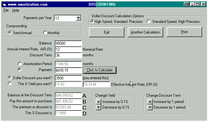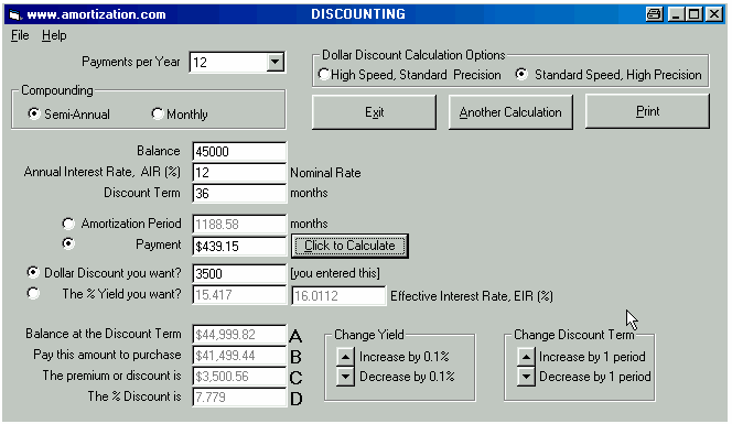A Broker arranges for a Lender to hand you a cheque for $45,000 and you hand your Broker a cheque for $3,500 to cover the cost of his total fees. The blended monthly payments (principal and interest) for a loan of $45,000 are $464.35 based on an annual interest rate of 12% with semi-annual compounding and amortized for 25 years. Using the MORTGAGE2 software you can see that the interest for the very first payment is $439.15 per month. With this interest only loan, the borrower is actually receiving $41,500 but is making interest only, monthly payments of $439.15 for the next 36 months based on a loan of $45,000. Using the DISCOUNTING software the TCOB is calculated as follows. Certain combinations of computers and operating systems will not let you enter the exact interest in the Payment box for an interest only. Just add .001 to the payment ( in this example $439.151) in order to get by this quirk. The payment will still come back as 439.15 and the two interest rates are still correct at two decimal places. The new interest rate due to the brokers total fees is 15.417% which translates into an effective interest rate of 16.0112 % due to semi-annual compounding. Thus the TCOB is 16.01 % at two decimal places, for $3,500 fees, using the Standard Speed High Precision. It is recommended to use the High Precision setting for all calculations unless you have a really slow computer. UNDERSTANDING THE DISCOUNTING PROGRAM: