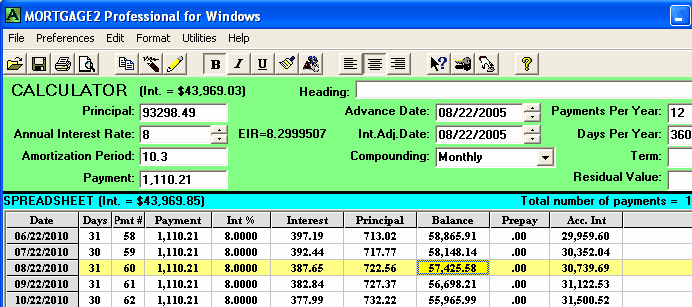 A mortgage has a face value of $45,000. The interest is to be 12% with semi-annual compounding, not in advance. The loan is to be repaid in three years. No payments of principal or interest are to be made during the three years. At the end of the three years all the outstanding principal and interest will be repaid in one payment. The total cost of all the fees is $3,500 and thus the borrower is actually receiving only $41,500 because the broker is getting his $3,500. A financial calculator could be used for this calculation, .. providing you know how to calculate the "12 % semi-annual compounding, monthly interest factor" which is 0.009758794179192. This factor is required to calculate the Future value (FV) of $45,000 in 36 months. One of the unique features of MORTGAGE2 PRO software is its ability to do PV/FV calculations without requiring you to understand how to calculate this interest factor, 0.009758794179192. 1.. You make the MORTGAGE2 PRO amortization schedule a negative amortization schedule by making all the payments equal to zero for the first 36 months. The balance at 36 months is the Future Value of $45,000 growing at 12% per year semi-annually compounded, which is $63,833.35 What you have is a series of FV results in a grid format from one month to 36 months which is more informative than the regular PV/FV financial calculator format. The factor 0.009758794179192 can also be obtained by using the MORTGAGE PRO Utilities Menu. 2.. Using a financial calculator the new monthly interest factor needs to be determined. In other words, what does the new interest really have to be on a monthly basis in order to grow $41,500 to $63,833.35 over 36 months? The new monthly interest factor is 0.01203244 as a decimal. To calculate the effective interest rate (EIR) add 1.0 to this new monthly interest factor and multiply by itself 12 times. Shown mathematically as; (1.01203244)^12 = 1.154338 Subtract 1.0 and multiply by 100 and the effective interest rate is 15.43 % at two decimal places. Thus the TCOB is 15.43%