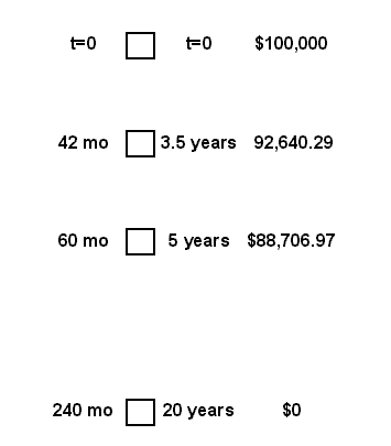 Calculating YIELDS on a Discounted Mortgage The yield of a mortgage (annual rate of return) bought at a discount or premium can be calculated given the original mortgage Principal (Present Value), the annual interest rate, compounding method the periodic payment and the amount paid for the mortgage. An investor wishes to purchase a $100,000 mortgage taken out at 9% over 20 years. Since the mortgage was issued , 42 monthly payments have been made. The loan is to be paid in full (the balloon payment is the 60th payment plus the balance) at the end of the fifth year (60 months). QUESTION: What is the yield if the purchase price of the mortgage is $79,000? First lets find out what the balance is after the 42nd payment. The payment below was automatically calculated after the first three values were typed in the CALCULATOR. Basically we are going to calculate a yield by paying $79,000 for a $92,640.29 mortgage for the next 18 months. The $92,640.289 mortgage has an amortization period of 20 years minus 3.5 years which is 16.5 years or 198 months and it is considered to be advanced on 04/10/2006. The discount is $92,640.29 - $79,000 = $13,649.93 Notice on 10/10/2007 the both balances blue and purple lines are the same, $88,706 (within 12 cents). ANSWER: The yield achieved is 20.73% and the balloon payment on 10/10/2007 after the 60th payment based upon the initial mortgage is $88,706.78 (in blue) or $88,706.90 (in purple) based upon the 18th payment of the new scenario as shown below by the DISCOUNTING program. Another way of visualizing this is to prepare a time line as shown below.