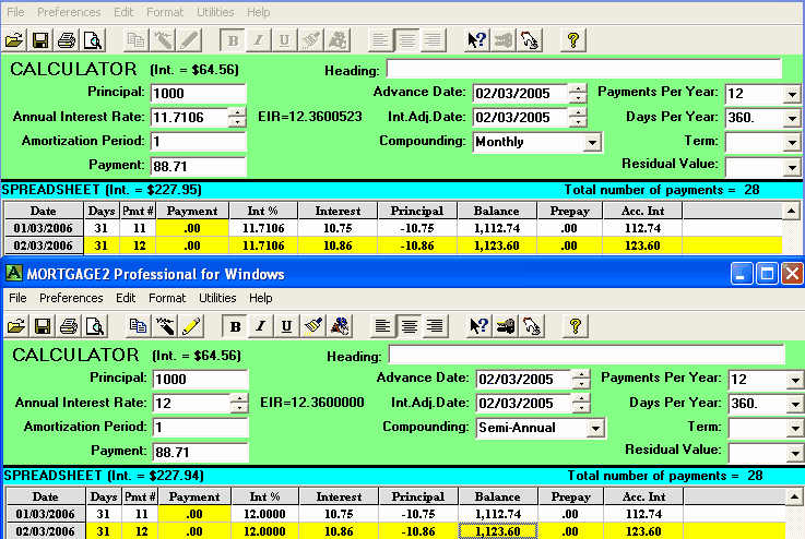 mortgage with an annual interest rate of The advantage of quoting effective interest rates is one does not need to be concerned about the type of compounding. An effective interest rate, EIR, can stand on its own merit. If someone offered you a one year loan of $1000 at an effective interest rate of 12.36% you would owe the lender $1,123.60 at the end of the year. This same loan could have been given to you at 11.7106% with monthly compounding or 12% with semi-annual compounding. The two loans are identical because they both have an effective interest rate of 12.36%. In other words an annual interest rate of 11.7106% with monthly compounding is exactly equivalent to an annual interest rate of 12% with semi-annual compounding. Both loans require you to pay back $1,123.60 at the end of the year. In this screenshot you can see that both loans due to deemed reinvestment (negative amortization schedule) lead to the same thing for the lender, because the EIR is the same! In summary the APR does not mean effective interest rate, EIR. The APR has absolutely nothing to do with the effective interest rate, EIR, by definition. In financial circles the EIR is meant to mean one thing and one thing only, ... the actual interest rate at the end of the year because of the compounding frequency, nothing more nothing less.