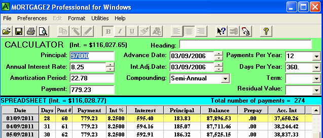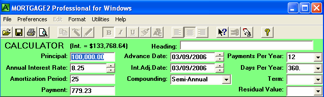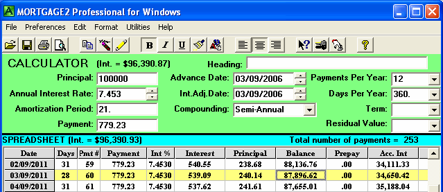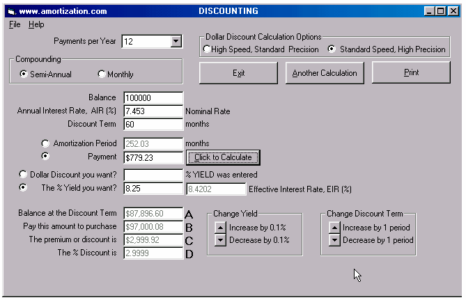 A Lender is offering a 3% cash back offer on a mortgage providing you sign up for a 5 year term. The mortgage would be closed for 5 years before you would be allowed to renegotiate the interest rate. Current 5 year interest rates are 8.25% and you need to borrow $100,000. The cashback of 3% would immediately put $3000 in your pocket if you signed (tempting you to buy new appliances, etcetera) or you could direct the cash back immediately to pay down the mortgage to $97,000. QUESTION: What to do? Let us assume you did not succumb to temptation and paid the mortgage down by the amount of the cash back, $3,000. Your monthly payments would be initially calculated to be $779.23 but your cashback reduces the initial mortgage to $97,000 thus after 60 months your outstanding balance is $87,896.43 as shown below; The Lender could have given you a lower interest rate in order to entice you into signing a five year term and that rate would be 7.453% as shown below. The 7.453% was arrived at by a trial and error technique. You pick a lower rate than 8.25%, recalculate on the amortization period until you zero in on the balance of $87,897.38 after 60 months, which is close enough to $87,896.43 This is a win-win scenario, unfortunately both wins are for the Lender. The Lender achieved two objectives; Firstly, the Lender got you to sign for 5 years because a $3000 cash back sounds and appears a lot better than lowering the rate from 8.25 down to 7.453, in fact some Lenders will give you up to .75 percent points off the published rates just for asking, especially if you have other business with them (investment vehicles such as Mutual Funds). Secondly, the Lender has you locked in for 60 months at a rate of 8.25%. If you do decide to payout out the mortgage before the term is over (because rates are dropping) your penalty is based upon the interest rate differential. For example, if after one year, the 4 year term rates are 7 % then the differential is is 1.25 (8.25-7.0) where as if the rate would have been 7.453 the differential would have been 0.453 (7.453-7.0). The larger the differential the larger your IRD "penalty". Buyer beware! Things are not always what they seem to be. ALTERNATIVE VIEWPOINT BELOW: Another way of looking at this example is to view it as a DISCOUNTING example. A $100,000 mortgage at 7.453% with a 5 year term. QUESTION: What price does one have to pay to purchase the mortgage and receive an 8.25% "yield" rather than the 7.453% "yield" over the next 60 months. ANSWER: $97,000 (see B below in the DISCOUNTING program)