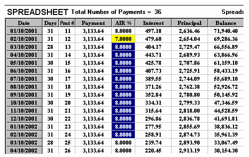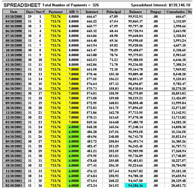 Adjustable Rate Mortgages are mortgages where the lender adjusts the interest rate each month or at an interval agreed upon by lender and borrower. If rates go down the borrower enjoys the benefits of paying less interest plus paying more off the balance providing the payment remains the same. If rates increase the lender enjoys the benefit of more interest at the expense of the borrower. This type of loan can be be a blessing and a curse. It is a fair gesture by a lender however verifying the balance owing at any time is extremely difficult unless the borrower has the appropriate financial software, such as MORTGAGE2 PRO. Adjustable rate mortgages (ARM) and variable rate mortgages are different names for the same thing. Americans call them ARMs and Canadians call them variable rate mortgages. Adjustable rate mortgages can yield tremendous savings to borrowers but the chore of verifying the changing amortization schedule can be overwhelming to a novice who is unfamiliar with amortization schedules. Some lenders will change the rate every month and leave the payment constant. Some lenders will recalculate the payment each month based upon the new rate and this type of ARM is very time consuming. It has been estimated that in North America, Billions of dollars each year in excessive interest is paid to lenders that make errors calculating ARMs. An added problem is, if the errors are at the beginning of the schedule they compound themselves throughout the entire schedule. Unless you verify the calculations you will never know. The changing rates can be simply typed directly into the amortization SPREADSHEET (yellow column) and the entire schedule is instantly recalculated, as in the example below. Using the MORTGAGE2 PRO software, changes in the nominal interest rate (Annual Interest Rate) are typed directly into the SPREADSHEET schedule. Payment #1, 12/14/2000 is the first blended payment and it is based upon the initial 12% as entered in the CALCULATOR. After the first payment was made the rate was changed to 6%. The interest due on a balance of $99,898.91 for the use of the money from 12/14/2000 to 01/14/2001 is $499.49 (.06/12 x 99,898.91). These large changes were purposely chosen to simplify the example. For example, the interest due on 12/14/2000 is 1% of the $100,000 a nice simple shift of the decimal point. After payment #2 was made the rate was changed to 3% for the upcoming month. The 3% annual interest rate, in the SPREADSHEET, is automatically divided by 12 and multiplied by $99,297.32 for an interest charge of $248.24 on 02/14/2001. The full payment #8, is applied towards reducing the balance to $94,408.52 because the interest rate was changed to zero on line 7 the month before.