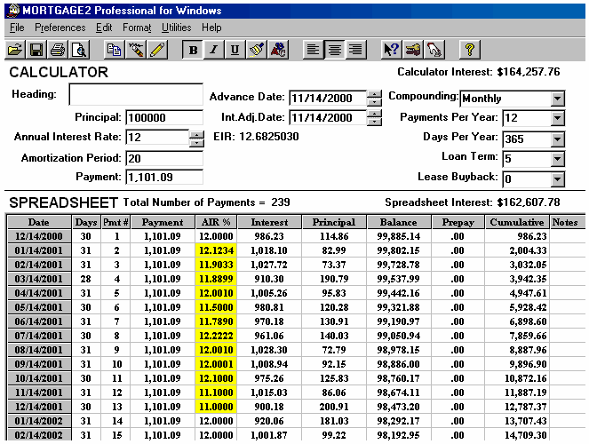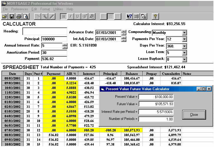 What if you took out an ARM on July 3rd 2001 as per the conditions in the CALCULATOR below. At the end of the first year would you be able to calculate or would your lender be able to tell you what the effective interest rate (EIR) or the APR was due to the changing interest rate each month? The EIR of 5.1161898 in the CALCULATOR is only valid if the rate was constant from month to month. To answer the question you change the rate each month to the appropriate values in the SPREADSHEET, then do a negative amortization schedule by changing all the payments to zero and making a note of the balance after one year ($105,571.93) which is really the Future Value that an investor looks at. Inserting that information in the MORTGAGE2 PRO PV/FV window you arrive at an effective interest rate of 5.571930%