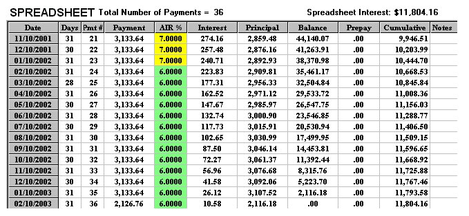 Assume you borrowed $100,000 and amortized the loan for three years starting at 8 % in the first year, 7% in the second year and 6% in the remaining third year. Monthly payments and monthly compounding were selected. QUESTION: How much interest would you save compared to paying 8% for the entire three years? Enter the data in the CALCULATOR section of the MORTGAGE2 PRO screen. The amortization schedule for that information will be immediately calculated and shown in the SPREADSHEET amortization schedule, as if the entire loan was to be at 8%. The entire schedule is not going to be at 8%, but you must start out in the calculator as that way then change the interest rates in the SPREADSHEET. Once changes are made in the amortization schedule SPREADSHEET the CALCULATOR information is no longer meaningful except as a reference point (Calculator Interest). Changes to the amortization schedule SPREADSHEET are now your focus. Using your mouse, place the cursor on the 12th payment interest rate cell (yellow) on the amortization schedule and change it to 7.000% and click on the cell, to insure the change is entered. When you click on the cell you will see the amortization schedule spreadsheet cells change indicating a cell change. Hold the shift key down and press the down arrow to highlight the cells down to the 24th payment and the amortization schedule should appear as below; Now do a Crtl+V (the standard Windows paste shortcut) and the amortization schedule appears as shown below; Do the same thing with interest rate cells 24 to 36 only this time using 6% and the amortization schedule will appear as below; All changes to the amortization schedule show up as yellow, however, the yellow colour for the portion of the interest rate column at 6%, was changed to green for ease of viewing in this example. Note, the monthly interest $223.83 portion for the 24th payment is determined by the value in the interest rate in the Int% cell above. This is how the program was designed to operate. Thus .07/12 x 38,370.98 = $223.83 You now have an amortization schedule for three years with a declining rate of 8%, 7% and 6% in the final year. The total interest cost due to the declining rates is $11,804.16 (Spreadsheet Interest) compared to $12,810.92 had you remained at the initial 8% throughout the 36 months (Calculator Interest). ANSWER: The declining rate, for this 3 year amortized loan, saved you $1,006.76 (12,810.92-11,804.16=1,006.76). The three year amortization period was purposely chosen in order to explain deemed reinvestment and show the significance of the effective interest rate. A 30 year amortization period example is shown at the bottom of this page and the savings achieved because of the three year declining rate are more significant.