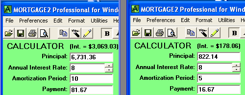 APR based upon variable future costs QUESTION: What if the borrower had monthly insurance premiums that were not constant but varied in the future? For example, using an 8%, 30 year amortized mortgage with monthly payments and monthly compounding on an amount of $100,000 as shown below. The first 10 years the monthly insurance premiums would be $81.67 and the next five years the premiums would be 16.67 per month. The present value of these two insurance premiums future cash flows must be calculated using 8% as the interest rate. Using the "3 out of 4 feature" in MORTGAGE2 PRO CALCULATOR we pretend we are going to borrow money at 8% for 10 years with monthly payments of 81.67 and the Principal will automatically be calculated as $6,731.36 which is the Present Value of that 10 year future cash flow. Now do the same for monthly insurance premiums of $16.67 but we must also do a PV-FV calculation to bring the $822.14 further back ten years to the present. The Present Value of the cash flows of the two insurance premiums is 6,731.36 + 370.40 = $7,101.76 and using the discounting program, the APR is 8.93% based upon 15 years (The % Yield you want). As can be seen below the APR based upon the full 30 years is 8.8% and that was easily calculated by pressing the up arrows and increasing the Discount Term to 360 months.
