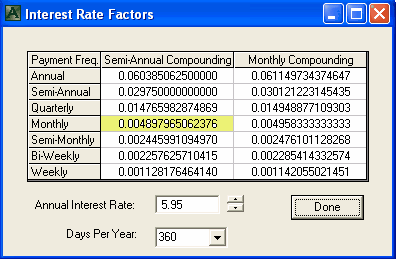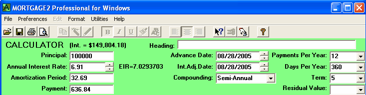 QUESTION: A lender offers a mortgage at 5.95% for the first year and 7.15% for the remaining four years or a blended rate of 6.85% for 5 years. Which is the better option? Let us first generate an amortization schedule based upon the 5.95% rate, then change the rate inside the SPREADSHEET schedule. Assume it to be $100,000 amortized for 25 years and we will use semi-annual compounding as this example is taken directly from a Canadian lenders brochure. We will also assume a constant cash flow meaning that the monthly payment remains the same over the 60 months. Some lenders recalculate and change the monthly payment at each rate change so it is always wise to ask the lender which method they use. We now change the rate from 5.95% for the last four years to 7.15 % as shown below; NOTE: the rate change for the 13th payment is entered at the 12th payment because as soon as the 12th payment is made the rate is immediately changed, that is how the MORTGAGE2 PRO amortization spreadsheet is designed to work. The constant, 360 day monthly interest factor for an AIR of 5.95% with semi-annual compounding is 0.004897965062376 x 98,342.33 = 481.68 (green) The balance owing (at Pmt #60 in green) to the lender after 5 years is $94,852.89 using 5.95% for year one and 7.15% for the next four years. One might be tempted now to just guess at a new rate until the balance after 60 payments is the same ($94,852.89), and that would be the blended rate. It would be nice if it was that simple, but it is not. Lenders reinvest your monthly payment each month (deemed reinvestment) in order to achieve the yield on your mortgage. For example a mortgage at a nominal rate (nominal rates are also called annual interest rates, AIR) of 12% using semi-annual compounding actually gives the lender a 12.36% effective interest rate (EIR). For every nominal rate quoted there is a corresponding effective interest rate due to the type of compounding chosen. If the nominal rate is annually compounded then the effective interest rate is equal to the nominal rate, thus a yearly basis is always implied when one speaks of an effective interest rate. A mathematical "trick" that works only for mortgages that have semi-annual compounding allows one to quickly figure out an EIR from an AIR is to divide the nominal rate by two, shift the decimal place two places to the left, square the result, shift the decimal place two places to the left again and add it to the initial nominal rate; AIR=12% EIR=12.36% One of the unique features of MORTGAGE2 PRO and MORTGAGE2 PRO PRO is the ability to to perform a present value /future value calculation on a cash flow and show what it accumulates to in the future. This is exactly what the lender does. Thus put all of the 60 payments equal to zero and the cash flow of $636.84 to the lender will accumulate to $140,443.98 if the lender reinvests the payment received each month. You now need a simple PV/FV calculator or using the one in MORTGAGE2 PRO that allows one to do a PV/FV calculation as shown below; The 7.028792 % from the PV/FV calculator is the effective interest rate, EIR. To get the corresponding AIR, using the CALCULATOR, take a few guess' at an AIR, and recalculate on any variable except the AIR, until you get the EIR to come close to 7.029 The 6.91% (which corresponds to the EIR of 7.0293703) is the correct blended rate that is equivalent to year one at 5.95% and the next four years at 7.15%. ANSWER: The lender offering a blended rate of 6.85%, is actually giving borrowers a bit of deal! Below is proof that 6.91% is the correct blended rate. That same cash flow appreciating at 6.91% (deemed reinvestment) for the next 60 months accumulates to $140,447.77 which is within $3.79 of the initial calculation. The difference is because the outcome is very sensitive to the number of decimal places used. It should be mentioned that you can also use a 365 day year in this analysis. North American lenders use both methods for monthly payment mortgages for various reasons. Below is the exact analysis as above, except using a 365 Days per Year basis, which is called an exact day monthly payment mortgage in the industry. You will notice after 60 payments (12 payments @ 5.95% and the remaining 48 payments @ 7.15%) that the borrower owes the lender approximately 20 dollars more using this method ($94,872.22 - $94,852.89 = $19.33). The lender is making a "little" more via the 365 day method. A complete analysis shows that the blended interest rate is greater in the third decimal place, and thus quoting rates to 2 decimal places hides this fact. The purpose of the exercise is to demonstrate the method used to verify the blended rate figure within reasonable limits. As mentioned above the deemed reinvestment method is very sensitive to the number of decimal places used in the calculation. Here is an area where standardization would be in order at least in North America.