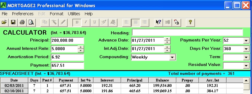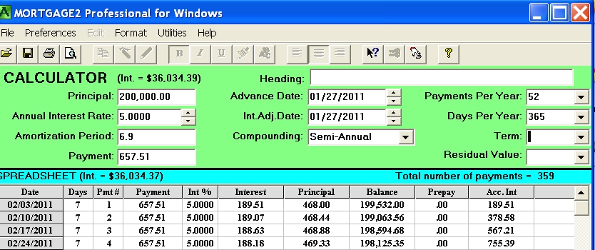 I want to thank the person who viewed my YOUTUBE mortgage video and brought the GMAC weekly and biweekly mortgage payment plan to my attention. It has been awhile since I searched the web for weekly lenders in the USA because in the past there were none. I will strive to be more current on the USA mortgage market. In view of the fact that Americans now have access to these new weekly and biweekly plans I will be more specific regarding my explanation why a Canadian monthly, biweekly or a weekly payment mortgage plan is better than any current USA mortgage plan. I will use the weekly example to prove my point. The example I wanted to compare to GMAC’s calculator output is as follows. The most important item to look at in any amortization schedule is the interest portion of the very first blended payment. If you divide that initial interest portion by the Principal borrowed ($200,000 in this example) you will know the value of the INTEREST FACTOR for the period of time. In this example it’s the weekly interest factor that is used at the end of each week to calculate the interest owing on the outstanding balance. The larger the interest factor the more interest you pay. The interest factor depends upon the “type of compounding” and the number of days in the year. The more frequent the compounding the larger the interest factor. A 360 day year (aka the “Banker’s year” in the USA) for weekly and biweekly payment mortgages also gives rise to a larger weekly interest factor compared to a 365 day year factor. The number of days per year chosen by the lender influences the value of interest factor. In this case the interest portion of the very first blended weekly payment I initially arrived at using my software (semi-annual compounding and a 365 day year which is now the defacto standard in Canada for weekly and biweekly mortgages) turned out to be $189.51 which is less than GMAC’s $192.31. The Canadian weekly interest factor (Screen C) is therefore smaller than GMAC’s method because GMAC is using more frequent compounding and also using a 360 day year in arriving at their weekly interest factor (Screen B). Some may say I am nitpicking but the difference in interest costs between the GMAC weekly in this example and the Canadian weekly is (compare the SPREADSHEET (Int= of screen B and C) is 36,703.64 minus 36,034.37 which is $669.23 more in interest! In this example, paying the same weekly payments using GMAC’s method, for the same annual interest rate for the same amount of Principal borrowed you pay $669 more in interest. The excess interest paid becomes even more pronounced when the amortization period is longer than 6.9 years. Six hundred and sixty nine dollars may not sound like a lot of money to some people but I would bet you would rather have it in your pocket instead of GMAC’s. Would it not be more informative and transparent to American borrowers to have a comparison screen (Screen D) similar to the one major Canadian Banks provide to their borrowers (sometimes reluctantly) showing the traditional monthly payment then comparing the savings by going to weekly or biweekly payments? This is common sense. I will repeat what I said in my YOUTUBE video, not all Banks are equal. Conclusion: