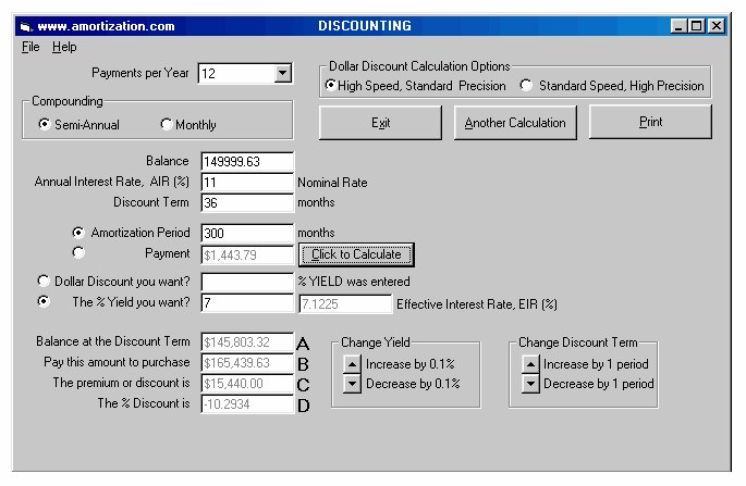 EXAMPLES 1. If the current balance of a Canadian mortgage was $149,999.63 and there were 36 months remaining on the term rate of 11% it would cost the borrower $15,440 in order to lower the rate to 7% for the next 36 months. The borrower would change four quarters for a dollar and save nothing if he/she paid the $15,440 "penalty". 2. A Canadian home builder was selling homes for $149,999.63 and taking back the 11% mortgage for 36 months. Sales were slow so he did a buy down calculation. He raised the price of the homes to $165,439.63 and took back the mortgages for 36 months at 7% and sales greatly improved as home buyers were impressed by the low interest rate. The builder received the exact amount of money.