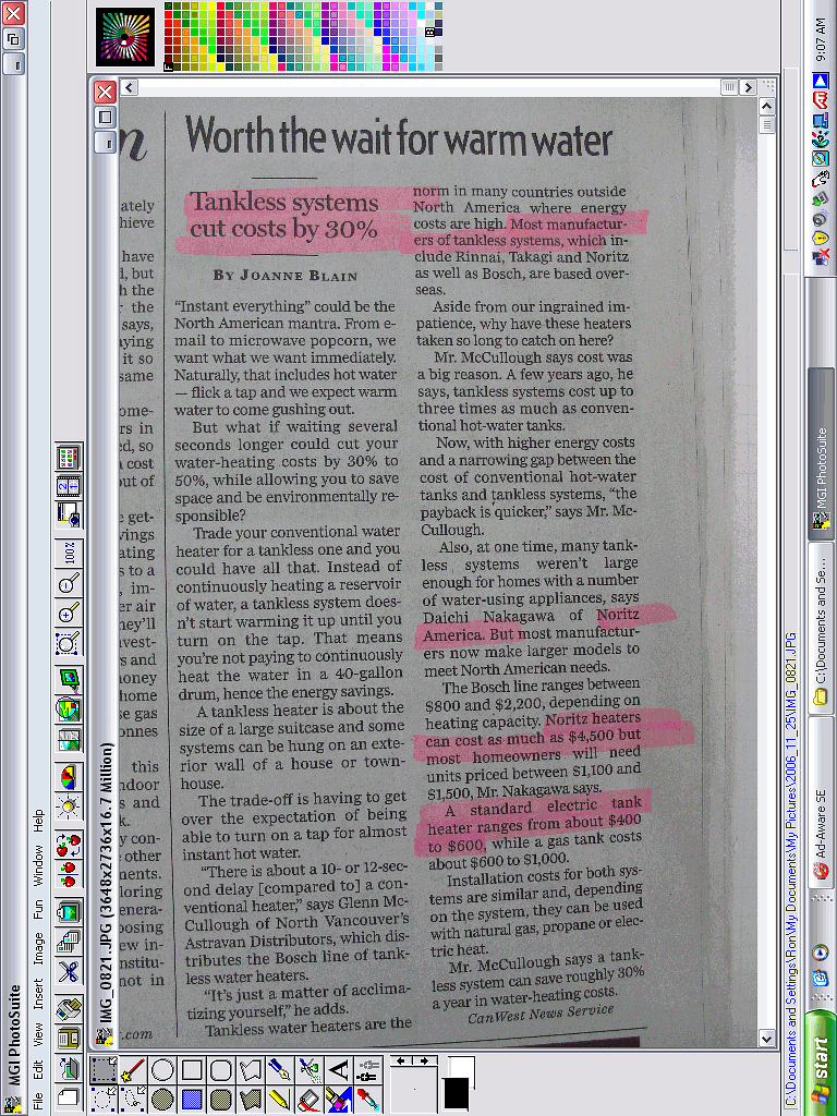 Here is a realistic, simple, energy saving idea that will significantly reduce electricity consumption, save you money and help the environment. The city of Toronto is just now in 2006 starting to implement inline hot water heaters. No standby loss. It does not make sense to retain 60 gallons of water (600 pounds) sitting at 150 F twenty four hours a day losing energy to a 50 F concrete floor (standby losses) waiting to be used for a 5 minute shower possibly once a day. We then use the water to shower, add cold water to bring the temperature down to a comfortable 100F (dilution losses). Electrical inline water heaters make sense over natural gas inline water heaters because electrical inline water heaters in comparison are 100% efficient. All of the energy ends up in the water with no exhaust gas loss because the electrical heating coil is surrounded by water as it passes by the heating coil. Insulating hot water lines and wrapping your hot water tank with insulation to minimize energy loss is insignificant and foolish because what little heat that is lost is captured in the house anyhow. There are two issues that need to be addressed by Provincial and Federal governments. If one showers at a rate of one or two gallons per minute the instantaneous electrical demands can be as much as 100 amps and in worse case scenarios in the winter months two of these units may be required. Obviously the power grid must be upgraded first in order to meet instantaneous demands! The inline electrical water heating units are currently expensive and most home owners find it difficult to justify the additional purchase and installation expenses even though energy savings and the payback are realistic. For this energy saving idea to happen (its been used in Europe for years) we need some leadership from OPA and the provincial and federal governments. All new homes constructed in Canada should have as an absolute minimum, a 300 amp electrical service, therefore allowing for up to 200A for inline water heating when the power grid is capable of handling these new demands. A 300 amp service is insignificant in the total cost of a home today. Secondly, tax breaks should be given to homeowners that install these new and/or retrofit inline electrical water heaters. Finally, in the long term, the OPA with all of its resources should look into a made in Canada solution and appoint a Canadian manufacturer (tendered of course) the rights to produce these units in Canada. Installing smart electrical meters in homes to charge Ontario consumers more for electricity at peak demand times is a small step in the right direction but the smart meters will only (hopefully) minimize peak demands on the grid, not save energy. People still have to shower, take baths, wash clothes now they will just do it at staggered times. Ron Cirotto, BASc., P.Eng