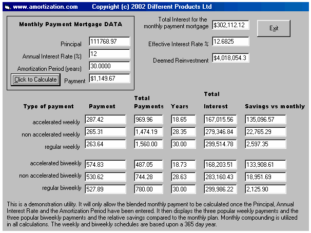 Assume you have a mortgage of $111,768.97 at 5% amortized for 30 years. The traditional monthly payments would be $600. The MORTGAGE2 PRO Calculator or any other financial calculator would calculate the "regular" biweekly payment to be $276.18 for the next 30 years and save you $578.19 in interest over the 30 years. The $276.92 biweekly payment (same yearly cash flow as the monthly payment) would save you $1,329.92 in interest over the next 29.82 years. The $300 biweekly payment, called the accelerated biweekly in Canada (the yearly cash flow of 13 monthly payments) would save you $19,943.40 over the next 25.14 years. The interest cost for the $300 biweekly mortgage is $84,287.63 Biweekly mortgages are rare in the USA. One can easily use the MORTGAGE2 PRO CALCULATOR to pick a monthly payment by trial and error and recalculate the amortization period until the Calculator interest is close to $84,287.63 As a first guess try a monthly payment of 300x26/12=$650 Increase it by increments of 50 cents and recalculate the amortization period by clicking on the "Amortization Period" prompt message in front of the Amortization Period Calculator box. The calculator interest of $84,286.79 is close enough to say you have approximately an "equivalent mortgage" over the next 25 years. As a side bar it is interesting to note that at low interest rates of 5% or 6% the weekly and the biweekly payment plans are almost the same as far as savings are concerned. Some people may not get too excited about savings of approximately $20,000. When the rates are in the 12% range the weekly and biweekly really start to outperform the traditional monthly mortgage, as can be readily seen by the example below. The same mortgage at 12% doing the accelerated biweekly payment of 574.83 would save $133,908.61 in interest over 18.73 years which is quite significant.
