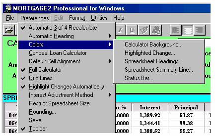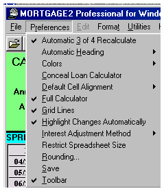 YOUR PREFERENCES Automatic 3 of 4 Recalculate: When selected on, entering any three of the first four calculator variables will automatically calculate the fourth. Automatic Heading: Check this to set the font size of your financial headings that appear on the top of every page of the schedule. Font sizes larger than 10 point will move your headings off centre. The Preference Menu above is what is usually selected (in advance) on all the downloaded files. Checking the 12 point makes the AMOUNT BORROWED in the heading of the schedule 12 point. Background Calculations: With this feature checked on, As soon as you type a change into the spreadsheet, the entire schedule is recalculated. If you were making a lot of changes in a large spreadsheet then it would save time to turn this off until all the changes are made. You could them turn it back on or just press F6 to recalculate all the changes. Colors: This lets you change colours on the five areas shown. Default Cell Alignment: This enables you to position your numbers in the amortization SPREADSHEET. The options are Centered, Left Aligned, or Right Aligned. Full Calculator: If one was going to do a lot of what if calculations utilizing the 3 out of 4 feature, then it would be much faster to turn off the full calculator. By holding down the tab key you can move in a a continuous loop in the first four calculator boxes only. The remaining calculator boxes are greyed out. Grid Lines: This turns on or off the lines for the amortization SPREADSHEET. ON - (Screenshot 23) OFF - (Screenshot 24) Highlight Changes Automatically: If one is making a lot of changes in a SPREADSHEET it is convenient to leave this feature on as it is easier to spot changes (yellow is the default colour). Interest Adjustment Method: Usually, it is best to leave it on Compounded Interest. Thus if your mortgage was calculated using semi-annual compounding the Interest adjustment would automatically be calculated using semi-annual compounding. Few Lenders use Exact Simple Interest any more for interest adjustments but the option is available to verify schedules of an earlier date. Restrict Spreadsheet Size: If you are working on a 20 year amortization period schedule and you start doing a lot zero payments the size of the spreadsheet will never grow or expand past 20 years. This feature just prevents a lot of wasted calculation time. Rounding: The choice is yours. Standard Rounding will more than likely allow your schedules to agree with most lenders. Save: ALWAYS be sure to click on the Save button before you exit the Preferences Menu, or else your preferences will not be saved. Toolbar: The choice is yours. Have this checked to enable the icons above the CALCULATOR. ON - (Screenshot 27) OFF - (Screenshot 28)