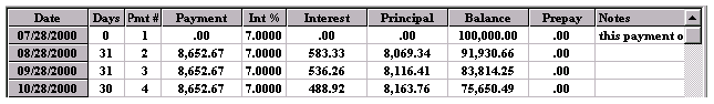 Working in the SPREADSHEET 1.. highlight an area prior to printing 2.. to make changes to a schedule 3.. to highlight a part of a column for its totals (clicking and highlighting with the mouse) For example, the amount of principal paid in 2001 is shown below as $502.76 on the 2001 Total line at the bottom of the SPREADSHEET because one of the cells (Pmt#1) was clicked by the mouse. And if you click using the mouse on Pmt#6 cell in the year 2002 the total line shows the yearly totals on the 2002 total line. The sub totals for payments #3 to #6 are shown on the Selected line at the bottom of the SPREADSHEET. Using the mouse you can highlight any area you wish for subtotals. Once you make changes to a schedule there is no reason to go back to the CALCULATOR as the CALCULATOR now only serves as a reference point. To avoid confusion you could go to the Preferences Menu and click on, Conceal Loan Calculator. The CALCULATOR would disappear. All you need to do is click on the first payment of the SPREADSHEET and click on the yellow pencil icon to insert an extra payment and you have the schedule below is simplified; (Screenshot 14) The spreadsheet contains all the information needed to be self explanatory (the compounding will be shown in the heading when it is printed). Payment #1 is "Days 0" and payment #2 is really the first payment due one month after the advance date of 03/23/2002. Once a SPREADSHEET cell is clicked on, the tool bar displays the icons that are active, by changing from grey to a colour. The cell you click on will display a fuzzy border as shown in the third payment below (powder blue). The only way to exit the spreadsheet is to click on any of the 11 calculator cells. The ENTER key enters your new information and moves you down to the next cell. If no information is entered, pressing the ENTER key moves you down one cell without any changes. The arrow keys are used to enter information in a cell and move in the direction pressed. Changes can only be made to the yellow coloured columns plus the Date column. Below is an example screen shot of a SPREADSHEET that shows how flexible the SPREADSHEET can be.