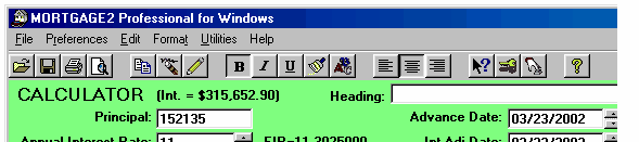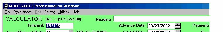 Click here for a Quick Reference Sheet The main screen starts with default information in the CALCULATOR and an amortization schedule SPREADSHEET based upon the default information in the CALCULATOR. Each time new information is entered in the CALCULATOR the SPREADSHEET will automatically generate a schedule based upon the new information. When you first run the program the cursor will be in the Principal box of the CALCULATOR and the background colour of the box will be blue. To move from box to box to change information press the tab key. The tab key moves you forward and shift+tab moves the cursor backwards. Holding the tab key down will cause the cursor to move in a continuous loop in the CALCULATOR. If you change any three, of the first four CALCULATOR boxes the remaining box will be automatically recalculated. You cannot specify information for all four boxes, as that would leave nothing to be calculated. For example, what would the interest rate have to be in order to borrow $200,000 for 31 years at monthly payments of $1500??? Answer, 8.4542%. The effective interest rate (EIR), 8.6328837 is displayed to the right of the nominal rate of 8.4542%. The EIR depends upon the type of compounding selected. The interest adjustment date defaults to the advance date unless you specify a different date. The Term input box is only important if you are going to renew a mortgage before the term expires, and effects only the calculation of the interest rate differential, IRD. If you change only one of the first four CALCULATOR boxes then you must decide which of the remaining boxes to recalculate, just like any hand held financial calculator. The instant you make a change to any CALCULATOR box the RECALC message appears and the SPREADSHEET is cleared. The CALCULATOR is waiting for one of two responses. Either you are changing two more calculator boxes or you are going to recalculate one of the remaining boxes. To recalculate a box, click on the box and press the F6 key or click on the prompt message in front of the CALCULATOR box. Both methods recalculate the information, in that box and the RECALC message will disappear. The SPREADSHEET will again appear with appropriate information. For example, what if you wanted the amortization period to be 27 years and pay $1500 per month at a 9% interest rate, how much Principal could you borrow?? Answer, $184,805.38 When the SPREADSHEET contains the appropriate mortgage information you can save the schedule. If the file/schedule you were making changes on already had a name you can click on File, Save and it will be saved with the changes. If you try to exit the spreadsheet before saving your spreadsheet changes you will be prompted by the message; If you are working on a new file/schedule (making changes) you can save it as a file with a unique name by clicking on; File, Save As. Your amortization schedules can be saved with meaningful names which will make it easier to recall when opening spreadsheet files as shown below;