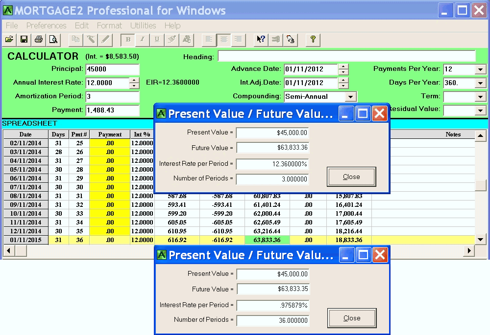 The following example of an interest accruing loan was purposely chosen even though the interest rate is high compared to the current rates in 2004. This particular example was used extensively by the mortgage brokers section of the Ontario Ministry of Finance in 1992. It is easier for a novice to follow the same example set out in the governments publications. Once the concepts are understood then any rate or principal can be used in full confidence. A mortgage with a face value of $45,000 is written up with an annual interest rate of 12% utilizing “semi-annual compounding, not in advance”. The loan is to be repaid in three years. No payments of principal or interest are to be paid during the three years. At the end of three years the outstanding principal and interest will be repaid in one payment. The total cost of all the fees relating to the loan is $3500. QUESTION: What is the effective interest rate of this loan? ANSWER: Just about any financial calculator could be used to solve this problem providing you are capable of calculating the semi-annual compounding, monthly, interest factor, i. Where: i = [(1+R/2)^(1/6)] – 1 and R = the annual interest rate i = 0.009758794 and the ^ operator is the exponent operator or you could use the MORTGAGE2 PRO, Utilities Menu and select, Interest Factors,
