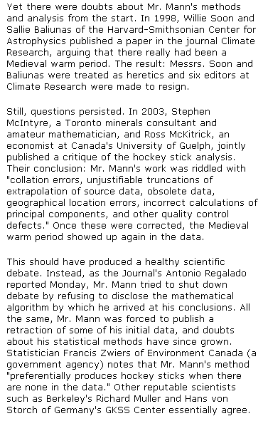 As a graduate chemical engineer I feel compelled to speak on this serious matter of global warming. I do not have an axe to grind because my software business has nothing to do with securing government grants for research into global warming. I do not work for a large corporation in the energy sector. I am not obliged to follow the apparent current scientific concensus concerning global warming. I am compelled by my scientific curiosity to seek the truth. I wanted to be an engineer early in high school and my fascination with science was initiated and nutured by the late Mr Rupert Helmer, my science and chemistry teacher to whom I will always be indebted. The scientific method has advanced the frontiers of knowledge and improved life immensely on this planet. It saddens me to see the current misuse of science by politicians and the instant gratification derived from premature conclusions that give some scientists their 15 minutes of fame. In my final year of chemical engineering we had to design and use computer models to run on the now infamous IBM 360 to predict how a distillation column would perform under various conditions. That simple bit of programming and matching of experimental data was a nightmare. Having said that, climate change computer models have become in vogue today as tools in the climate change business. In the May 2006 issue of New Scientist (page 7) it is stated that a climate change computer model could infer that by the year 3000 our climate could warm by as much as 7.7 degrees C. That’s right, its not a misprint, the climate model predicts that in 994 years “the climate could warm by as much as 7.7C” That ludicrous statement is incredible, misleading and complete nonsense with respect to predicting the climate in 1000 years based upon current computer climate models. This 1000 year prediction is junk food science at its best! The most powerful computer models of the day cannot forecast the weather/climate for the next 30 days let alone 1000 years into the future. The best example of misleading information derived from climate change models is the now infamous hockey stick graph, that allegedly proved the global temperature rising dramatically from 1900 to 2000. Two Canadian researchers, Steve McIntyre and Ross McKitrick tried to verify this graph which was given the blessing of the United Nations, in the UN third assessment report in 2001. Michael Mann and his co workers who published the hockey stick graph were very reluctant to give their “data” to others so that it could be verified. In fact it took 6 years before anyone thought of verifying the hockey stick graph because it was published by the United Nations, that to some is beyond reproach. In the end the two Canadian researchers found that they could feed any data they wanted into Michael Mann’s computer climate change model and make the graph appear any way they wished. Michael Mann's graph is now dismissed and recognized as nonsense by climate scientists around the world. However, for over six years the infamous graph was trotted out in front of every one and any one to prove that planet earth is warming dramatically. Earth’s climate is continuously (and has been for a long time) changing because the planet is not in thermodynamic equilibrium. It is impossible to perform a thermodynamic energy balance on planet earth and describe earth’s climate by a single temperature. Therefore referring to an average global temperature is as meaningless as quoting an average global telephone number. These principles are obvious to anyone who understands thermodynamics. The apparent rapid climate changes of late, are real and extremely complicated. Climate management, if possible, will not be achieved by simplistic solutions such as the KYOTO accord and its unrealistic emission targets of green house gases. The billions of dollars that would be wasted on carbon emission credits that Canada would pay to other countries should instead be used to immediately study and implement ways of making our use of energy more efficient until we move to a non fossil fuel energy source. Restricted shower nozzles and bricks in the toilet and every one taking a bicycle to work are not going to make a dent in our energy consumption. Very difficult, realistic and practical decisions based on reproducible scientific facts are going to be required and soon! Until these difficult decisions are made, here is a simple first step that will put Canadians on the KYOTO road. Obviously you are interested in numbers and interested in the truth or else you would not be on this web site. If you think the Banks have been pulling the wool over your eyes, they are amateurs compared to the cult of KYOTO ACCORD high priests. For an in depth, unbiased and factual discussion of "global warming" and examples of the current misuse of science in the Kyoto accord, the following book is a must read! As concerned and informed citizens of the planet we must shed unscientific, romantic notions of the planet. We need to address global warming with realistic solutions today that dont require a paradigm shift in thinking or life style. If it is wrong to put future generations at risk of living on a defiled planet then it is also wrong to put current people at risk of a lower standard of living. I am sick and tired of listening to people complain about the so called future dilema without ever offering viable solutions now, other than destroying the world economy! Here is for example, a practical, realistic and achievable energy saving idea that can be achieved today, click here yet no one has even entertained implimenting it anywhere in Canada. The following book is not sexy, fashionable or full of power point graphs but it is factual. You can either be taken in by Hollywood do gooders or you can decide for yourself, whats fact or fiction, once you digest this book! TAKEN BY STORM, The troubled science, policy and politics of global warming. by Dr. Chris