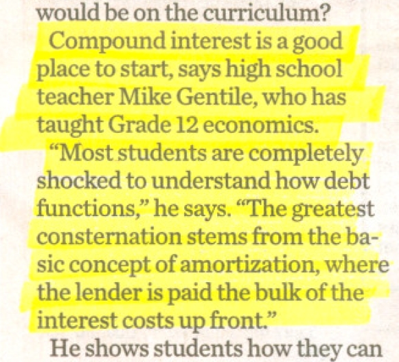 Maybe the first rule to learn on how to avoid the debt trap, is to be selective in who you listen to regarding mortgages. A recent article in a newspaper quotes an Ontario grade 12 Economics teacher’s confusing referral to compound interest. This teacher needs a refresher course in mathematics. He suggests compound interest is a good place to start in teaching students money skills and then goes on to talk about the bulk of the interest costs being paid up front, incorrectly implying compound interest has something to do with this phenomena. The first interest calculation for the first month is based on the outstanding balance which is the initial loan. If the monthly payment is just covering the interest then obviously interest costs are horrendous at the front end. To be perfectly clear, compound interest has NOTHING to do with the bulk of the interest costs being upfront. His mention of compound interest is very confusing and misleading, especially to novice students. Automobile loans, personal loans and mortgages as just “loans” because they are all calculated the same way. The only difference is the numerical value of the interest factor. First of all, compound interest is never charged on any loan if the blended payments are made on time. Compounding by definition is growth upon growth. The only time compound interest is charged on a loan is when a payment is late or missed. The interest owing is added to the balance and then next month the interest calculations are based upon interest calculated on an outstanding balance plus interest. From that point on you are paying compound interest on your loan, by definition. If your payments are made on time, the only person making compound interest on your loan is the lender if he reinvests your monthly loan payments at the same interest rate to someone else each month. The type of compounding determines the value of the interest factor used to calculate how the lenders money will grow in a compounded manner. This is where the confusion starts. In the legal documents, Canadian mortgages have the confusing phrase, “semi-annual compounding, not in advance” always following the annual interest rate.