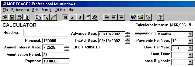 Below is a classic example, of smoke and mirrors, not to mention a misleading web advertisement . Let us investigate further into, .. "HOW IT WORKS - An Example". Let us look at this claim a little closer. Not to be a nit picker but the monthly payment quoted is not very accurate, it should be $1,100.65 not $1,100.24 as can be seen immediately below. The reference point is the total interest you would pay in this example, that is $246,233 (to the closest dollar) if you did nothing. The only way that this company can save you money by chopping 6 years off the amortization period (thus reducing it to 24 years) and keeping the monthly payments the same for a mortgage of $150,000 is to have the interest rate reduced to 7.2525% from 8% as you can see from below, by changing the amortization period to 24 years and then recalculating on the annual interest rate. Your savings would be $79,248 ($246,233 - $166,986 = $79,247) not the $66,000 as claimed. What happened to the difference of $13,247? ($79,247-$66,000=$13,2478) An amortization schedule, or a calculation like the one above, in advance, before signing anything, would certainly shed some light on this matter. BUYER BEWARE !!! Amortization Schedules have been around since 450 BC, when Nehemiah the governor of Jerusalem reformed the mortgage usury laws.