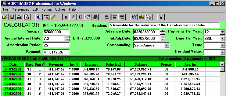 The exact amount of the current National debt (March 31, 2004) is very difficult to state for many reasons. The only figure I would believe is directly from our current Prime Minister. As Prime Minister he must be aware of this information. Newspaper articles are only approximations because traditionally our Federal government has been reluctant to disclose in detail this type of information. The examples concerning the National Debt, on this site are for illustrative purposes and to convince Canadians that a simple amortization schedule is not ROCKET SCIENCE. Amortization schedules have been around since 450 BC when Nehemiah, the governor of Jerusalem revised the usury laws. As a concerned Canadian, I urge you to write to the Honourable, Prime Minister, Paul Martin and ask him why Canadians cannot be informed, via the Federal governments web site, about the National Debt as an amortization schedule. The National Debt amortization schedule could be updated as often as the payments are made and as often as the interest rate changes. Thus, all Canadians could have 24 and 7 access to our National debt information. I believe disclosure and accountability are part of the Prime Ministers current mantra. Its time to walk the talk. For example; Consider a 500 BILLION dollar Canadian mortgage at an annul