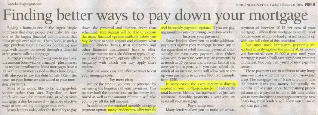 A recent newspaper article, “Finding better ways to pay down your mortgage” caught my eye. The article was probably written by a Realtor because it states, “Your Realtor will be able to explain the many financial options available before you buy”. If the writer wanted to plug a profession, it should have been Mortgage Brokers not Realtors. Realtors specialize in the logistics of selling houses. Mortgage Brokers specialize in all aspects of mortgages! A vague and potentially confusing explanation in the article, for a novice home buyer with a mortgage, is the writer states twice, that in most cases/most lump sum payments or extra money is applied directly against the principal, implying that there are some normal instances when the extra money or lump sum goes towards the interest. The wording should have been,.. IN ALL CASES EXCEPT TWO and then name or explain them. An interest charge is a cost to a borrower for the use of other peoples money. By definition, the very first penny in excess of the interest owing at the end of a period (at the end of the month, week or biweekly period) is applied towards paying down the principal. Nobody pays down interest in advance as the writer’s sloppy explanation implies. This is a common misconception that I have heard many times over the past 25 years. The two exceptions of extra money going towards interest is if a mortgage is in a negative amortization mode, which occurs when your payment is less than the interest that is due for that period, or if the borrower is paying the Interest Rate Differential, IRD to prematurely exit the term. Both are unique situations and not referred to as paying down your mortgage. Using “extra money”, “pay down” and “lump sum payments” interchangeably is confusing to a novice. This is analogous to using the expressions, “climate change”, global warming” and “pollution” all to mean the same thing, .. which they are not! Chose your experts carefully!!!