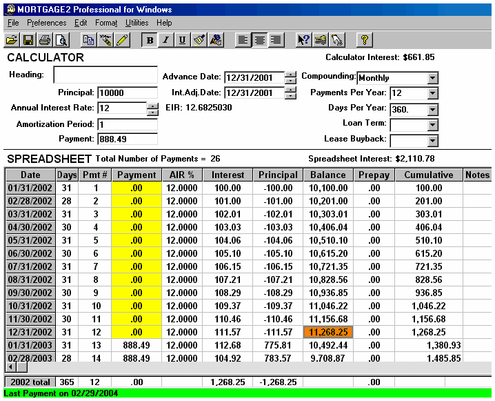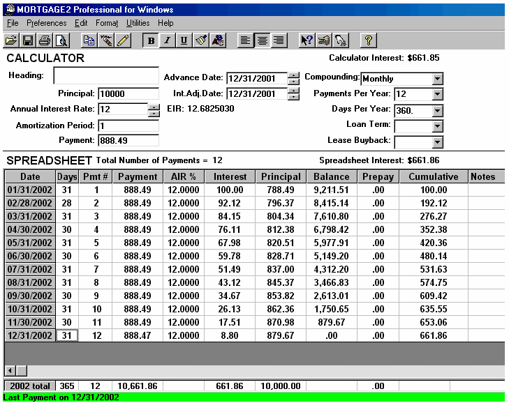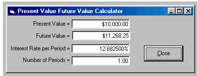 The effective interest rate, EIR, is a very useful and informative number. The EIR allows mortgages and loans to be compared before delving into points and transaction fees. If two loans or mortgages have the same EIR, they are equivalent and cost the borrower the same in interest. Using EIRs to compare loans or mortgages removes the uncertainty of not knowing the type of "compounding" used. The following example using monthly compounding and 12% as the Annual Interest Rate was selected on purpose as 1% per month would be easier to visualize. Any other type of compounding could have been chosen. The PV/FV schedule is a powerful tool that can be used to explain a few important concepts. If you borrowed $10,000 for one year at an annual interest rate of 12% and were given an amortization schedule it would appear as shown below; You might be tempted to conclude that the lender made only $661.85 in interest for the year. You would be correct if the lender took your monthly payments and put them under a mattress. However the lender reinvests your monthly payments each month (deemed reinvestment) and ends up with more interest due to the compounding effect. The effective interest rate (EIR) for this loan is 12.68250% because of monthly compounding. Take the EIR as a decimal and add 1 to it and you have 1.0 + 0.126825 = 1.126825 $10,000 x 1.126825 = $11,268.25 In essence the lender gets back his $10,000 at the end of the year plus $1,268.25 in interest due to reinvestment. The EIR is a very informative number because by adding 1 to it and multiplying by the original you discover the lenders actual return on investment. As further proof of this make all the payments zero in the amortization schedule and you discover that the accumulation is the same $11,268.25 after 12 payments. If you fancy yourself as a mathematician you will be interested to note that any financial calculator (as shown below) will arrive at the same numbers. Notice that if the Number of Periods of the loan is chosen as a year (or a multiple of a year) the financial calculator will always calculate the effective interest rate 12.6825% and if the Number of Periods is entered as one month, the Interest Rate per Period is 1%