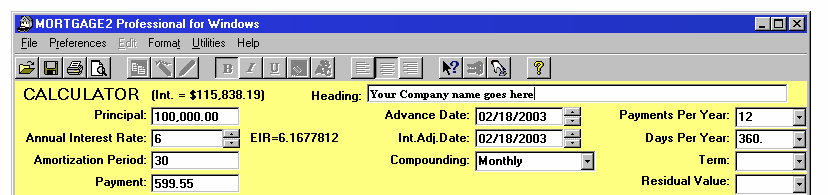 Click on the Heading: box with the mouse to gain access. Type in anything you want to be printed at the top of the amortization schedule when printed. Real Estate lawyers that generate many schedules a day often have the their company name in this spot thus eliminating the need to retype it each time.
