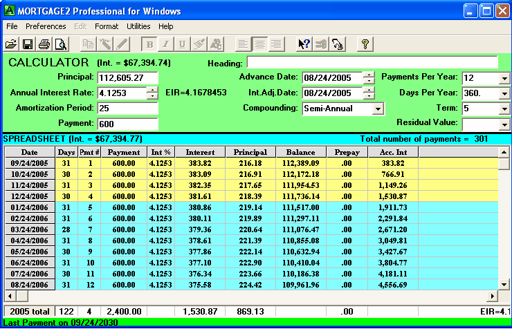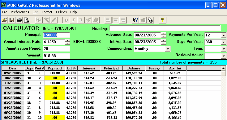 A summary of the types of amortization schedules the MORTGAGE2 PRO software package calculates: 1.. A fixed rate mortgage (FRM) with blended monthly payments. 2.. A negative amortization schedule where all or some of the payments are set to zero. 3.. An amortization schedule with missing payments and the interest is recapitalized (deemed reinvestment) with or without penalties being charged. 4.. ARM An adjustable rate mortgage where the rate can be changed every month or every day. 5.. An amortization schedule based upon the Bankers year or the exact day 365 day monthly blended payment mortgage. 6.. Weekly, biweekly, semi- monthly, monthly, quarterly, half yearly and yearly payment schedules. 7.. Amortization schedules based upon any combination of payment frequency and compounding frequency. 8.. Amortization schedules based upon a fixed principal payment plus interest. 9.. An amortization schedule with yearly anniversary payments. 10.. An amortization schedule with negative prepayments as required in a builders loan. 11.. An amortization schedule that allows one to easily change payment frequency in midstream and continue on with the same schedule. 12.. An amortization schedule that shows an expanded present value future value scenario. 13.. A Monthly Compounding, Interest Only payment, amortization schedule. 14.. A Present Value/Future Value, Financial Calculator is available from the Utilities Menu. 15..A declining interest rate schedule with a constant payments or declining payments.. Custom Logo Schedule - If you rename your corporate logo image as RB.BMP file and make the logo a small file, it can be displayed and printed on the top right hand corner of every amortization schedule printed.
